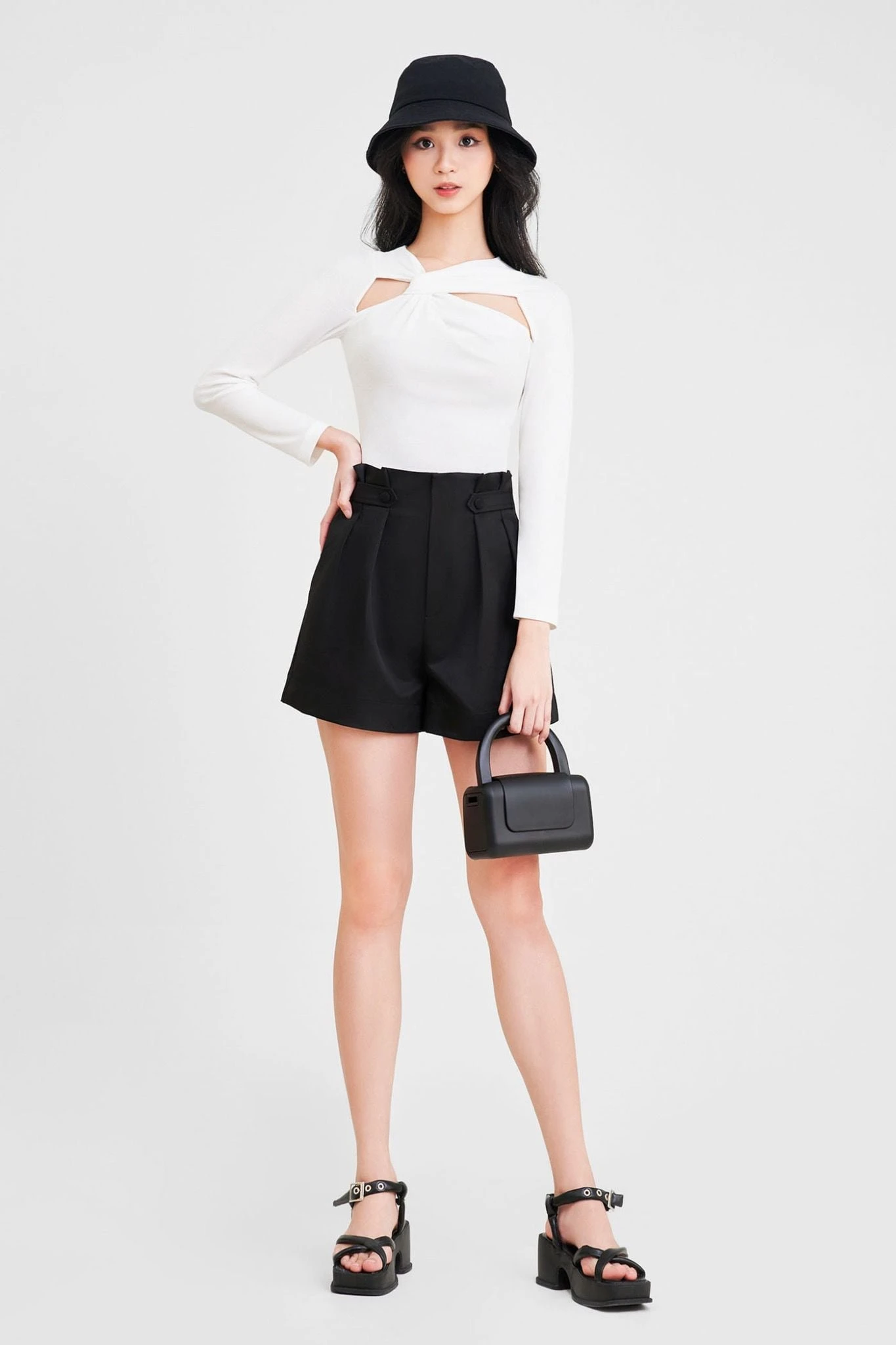 Áo trắng tay dài dáng ôm với chi tiết cut out ở ngực mang lại cảm giác nhẹ nhàng. Quần shorts đen cạp cao, phom suông nhẹ với đường xếp ly giúp tổng thể trang phục trở nên gọn gàng nhưng không bó buộc. Mũ bucket, túi xách mini và xăng đan đế dày là những phụ kiện quen thuộc, phù hợp cho các hoạt động dạo phố hay gặp gỡ bạn bè
