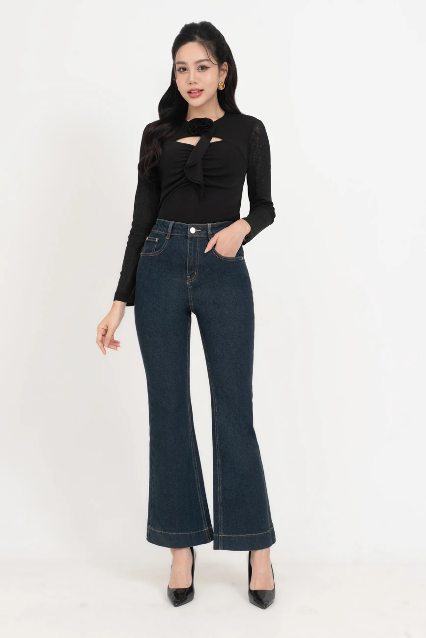Áo đen dáng ôm với chất liệu mỏng nhẹ, phần tay hơi xuyên thấu mang lại cảm giác mềm mại và nữ tính. Chi tiết cut out nhỏ trước ngực kết hợp các đường xếp giúp chiếc áo có thêm chiều sâu mà không quá nổi bật. Quần jeans xanh đậm cạp cao, ống loe nhẹ đóng vai trò tạo tỷ lệ cân đối cho cơ thể, giúp đôi chân trông dài hơn