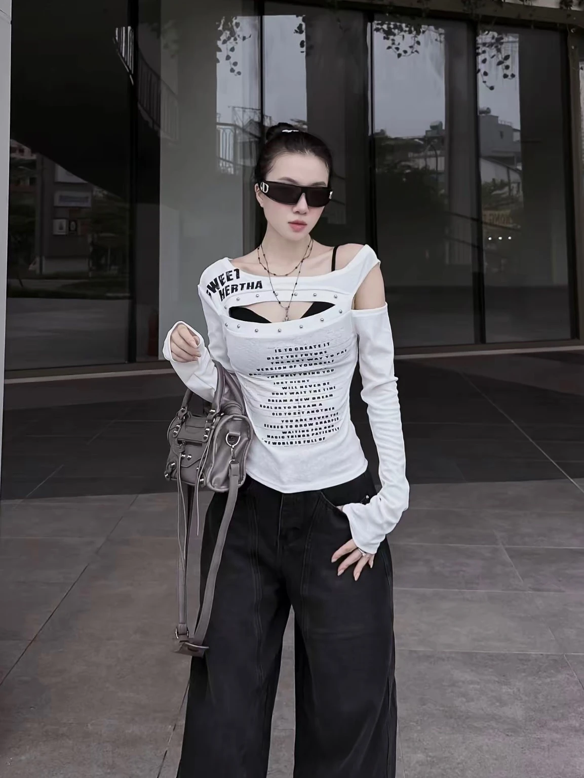 Áo thun trắng dáng ôm với thiết kế bất đối xứng, phần vai trễ cùng chi tiết cut out nhỏ ở ngực. Viền đinh tán kim loại và họa tiết chữ in đen giúp chiếc áo không bị đơn điệu dù sử dụng gam màu sáng. Cách phối áo cùng bra đen bên trong giúp trang phục có chiều sâu thị giác mà không quá cầu kỳ. Quần ống rộng màu đen, phom suông dài đóng vai trò cân bằng lại phần thân trên ôm sát, tạo nên tỷ lệ hài hòa cho cơ thể
