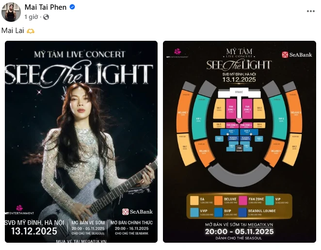 Concert See The Light sẽ diễn ra vào tháng 12 tại Sân vận động Mỹ Đình. Lần trở lại này, Mỹ Tâm đặt mục tiêu phá chính kỷ lục cũ của mình, nâng quy mô lên đến 40.000 người. Không chỉ dừng ở con số ấn tượng, concert còn được đầu tư mạnh tay cả về sân khấu, âm thanh, ánh sáng lẫn khâu sản xuất.