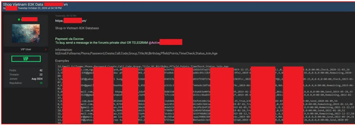 Vào trung tuần tháng 10/2024, 83.000 bản ghi dữ liệu của trang bán lẻ đồ điện tử A (tên đơn vị đã được thay đổi) bị rao bán trên không gian mạng , với dữ liệu thông tin khách hàng bị lộ lọt gồm ID, email, họ tên, số điện thoại, mật khẩu đã mã hóa và một số thông tin giao dịch liên quan. Nhiều tệp dữ liệu bao gồm thông tin tài khoản, mật khẩu liên quan đến trang bán lẻ đồ điện tử A trên nền tảng lưu trữ dữ liệu lộ lọt IntelX.