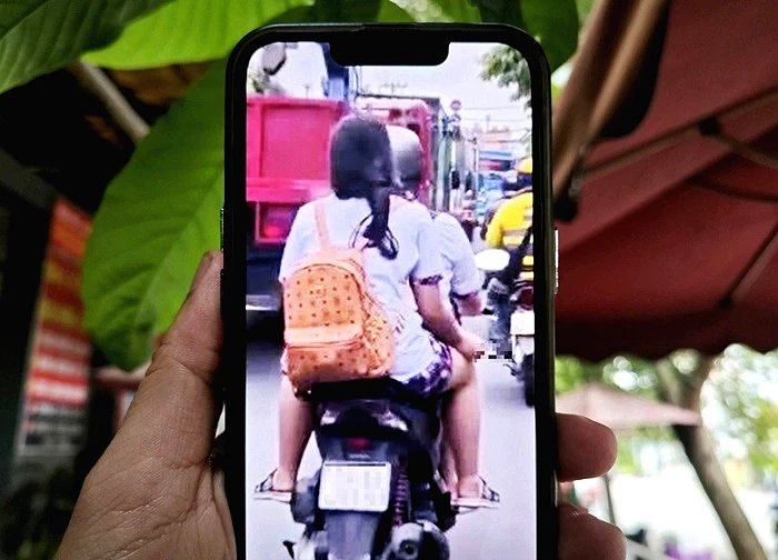 Lực lượng chức năng đang xác minh clip hai nữ sinh chạy xe máy trên đường ở xã Bà Điểm, trong đó, nữ sinh ngồi sau không đội nón bảo hiểm và hút thuốc lá khi xe đang chạy.
