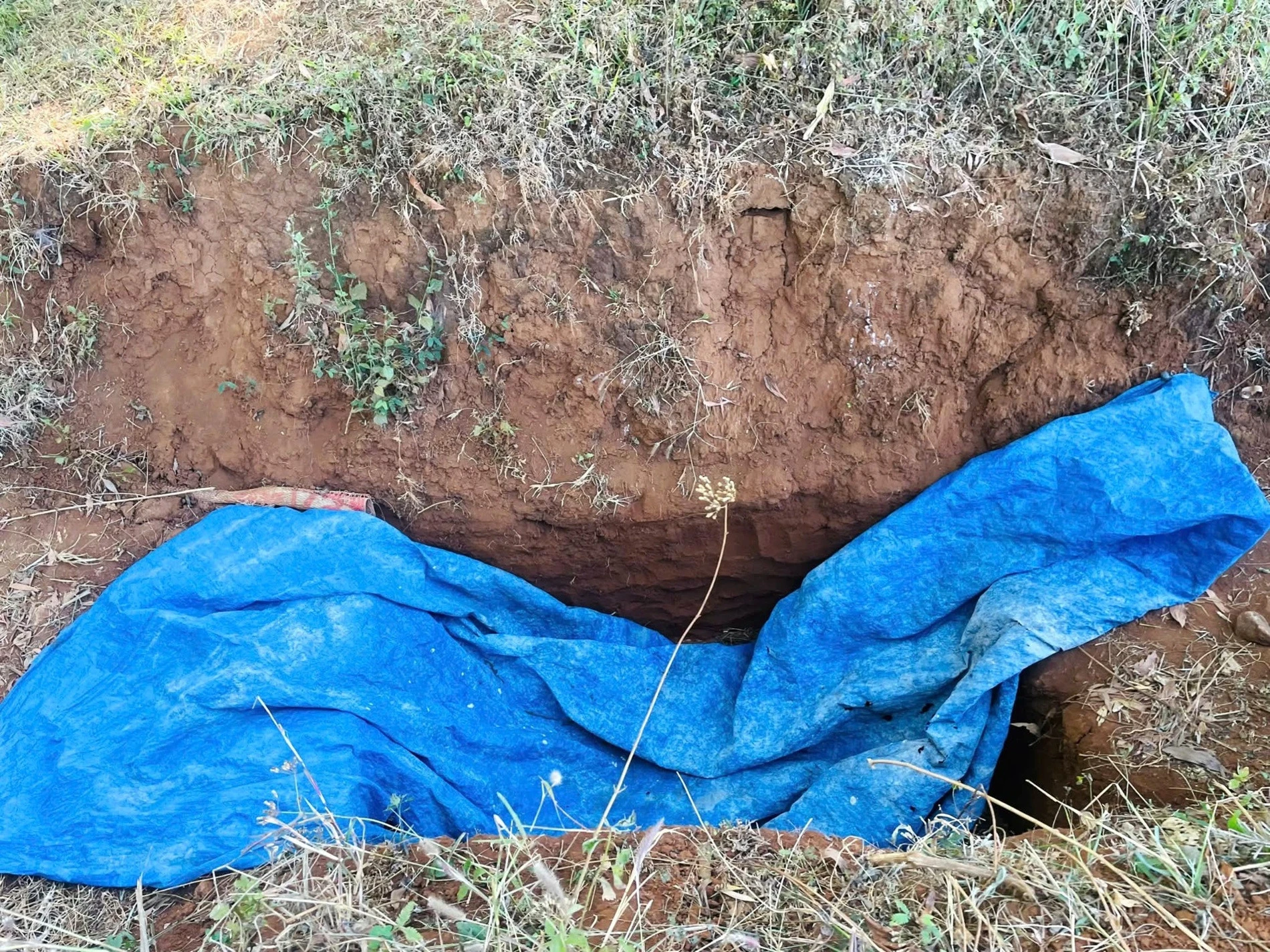 Khu vực hố đào hình chữ nhật, sâu khoảng 1m, nơi giấu chiếc xe máy nghi là phương tiện hai đối tượng sử dụng khi gây án. Ảnh: G.X