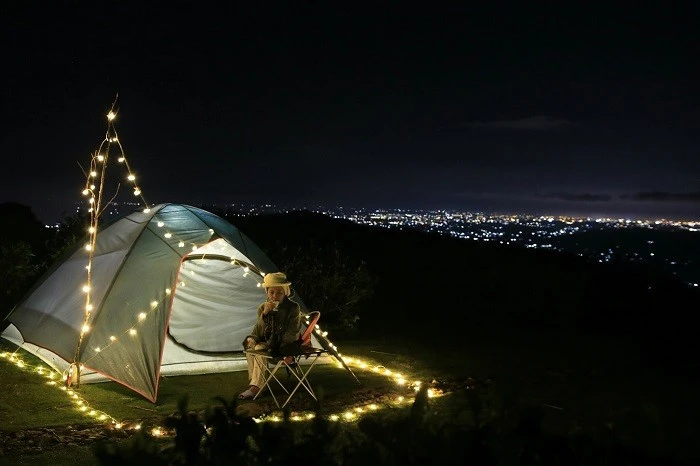 Ngắm mây, đón bình minh đồng nghĩa với việc phải dậy sớm. Với những người ngại di chuyển từ tinh mơ, lựa chọn cắm trại qua đêm trên đồi là phương án lý tưởng. Giữa không gian cao thoáng, tách biệt khỏi phố xá, du khách có thể ngủ giữa đất trời, sáng thức dậy đã kịp chào mặt trời vừa ló rạng. Ban đêm, đồi Vô Ưu gần như chỉ còn tiếng gió và âm thanh núi rừng, mang lại cảm giác biệt lập hoàn toàn với nhịp sống thường ngày. Ảnh Vudumuc