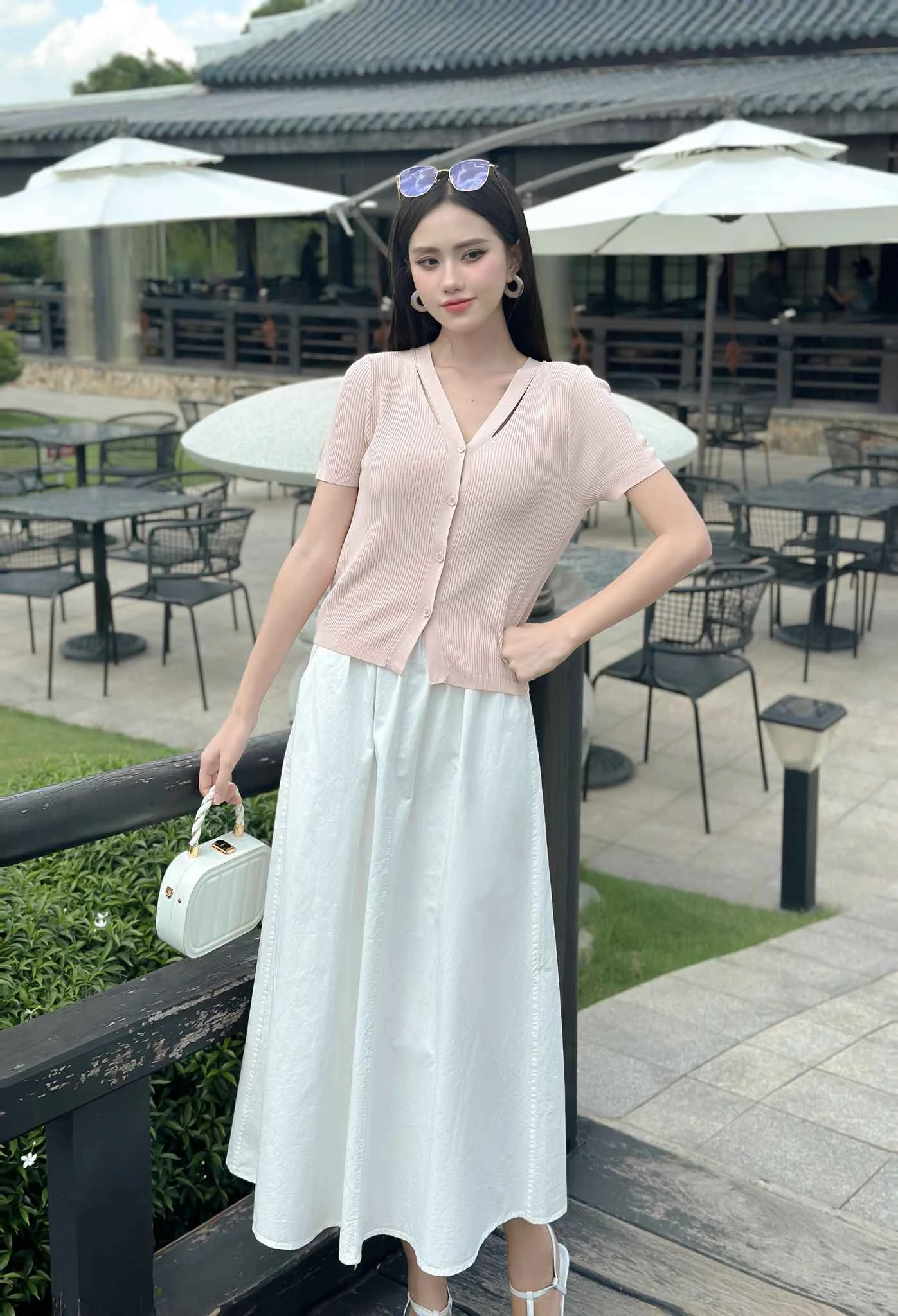Bề mặt dệt kim mảnh, dệt gân khi mặc cùng chân váy trắng xòe nhẹ, tạo nên bản phối thời trang dịu dàng như nắng sớm.