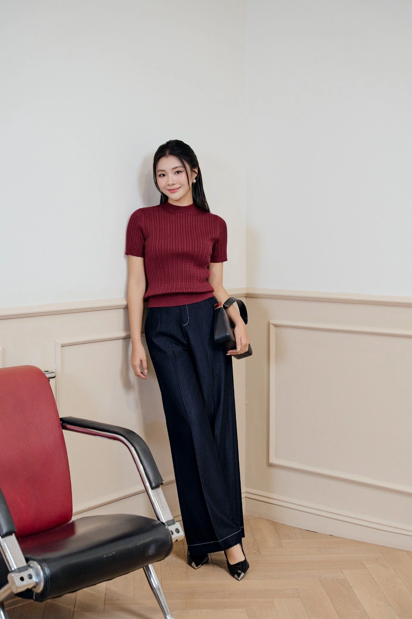 Nổi bật với vẻ đẹp quý phái, chiếc áo dệt kim cộc tay màu đỏ mận là điểm nhấn hoàn hảo . ẢNH: NEM FASHION