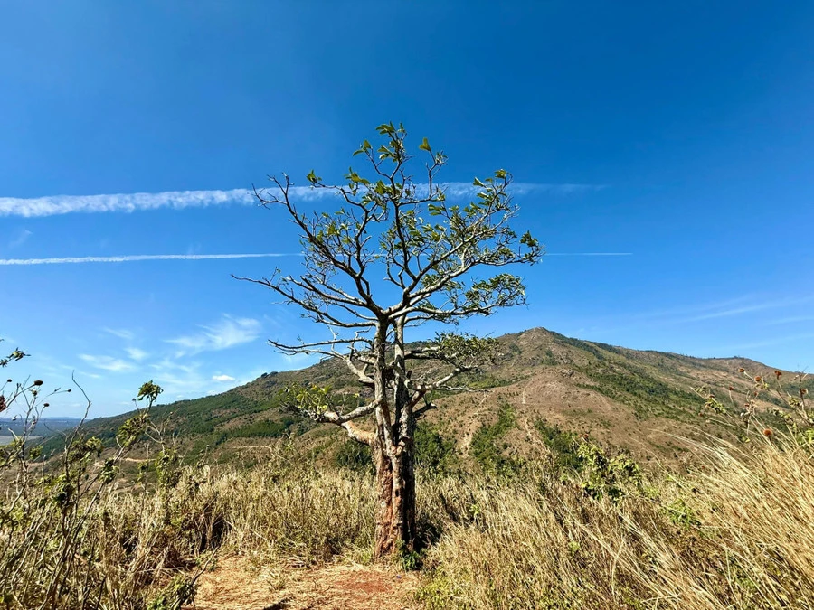 Đứng dưới chân núi nhìn lên phía xa, cảnh vật bên trên thôi thúc tôi tìm đường lên đỉnh núi. Nhờ sự giúp đỡ của người dân mưu sinh bằng nghề chở khách bằng xe máy, tôi trải nghiệm một đoạn đường đầu tiên, rồi tiếp tục tự mình leo núi, khám phá Chư Đang Ya giữa mùa khô cao nguyên lộng gió.