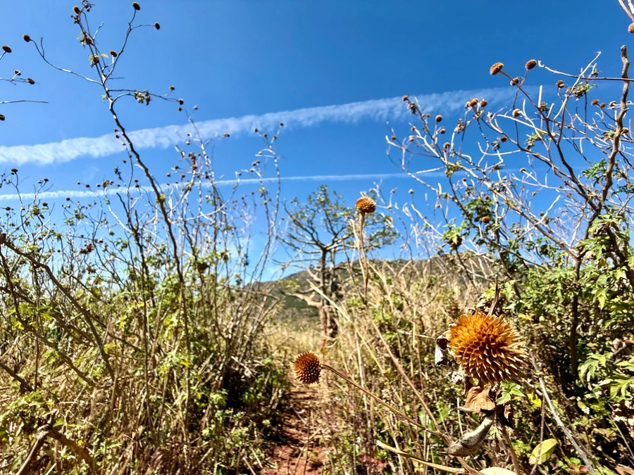 Giữa những cơn gió thông thốc, tôi men theo con đường mòn phủ dày đất đỏ để leo lên cao. Không vội vã, tôi thảnh thơi tận hưởng không gian thiên nhiên rộng mở, vừa đi vừa thưởng ngoạn cảnh núi đồi mê hoặc. Dưới chân là những bụi dong riềng còn sót lại, trở thành điểm tựa để tôi bám vào. Tôi dừng chân, chậm rãi ngắm nhìn từng vạt cỏ đuôi chồn đã ngả vàng, nâu khô, xào xạc trong tiết trời hanh hao, vẽ nên sắc thái khô cằn mà đầy thi vị cho núi đồi. Những đồng cỏ cứ thế lan xa, bất tận đến vô cùng.