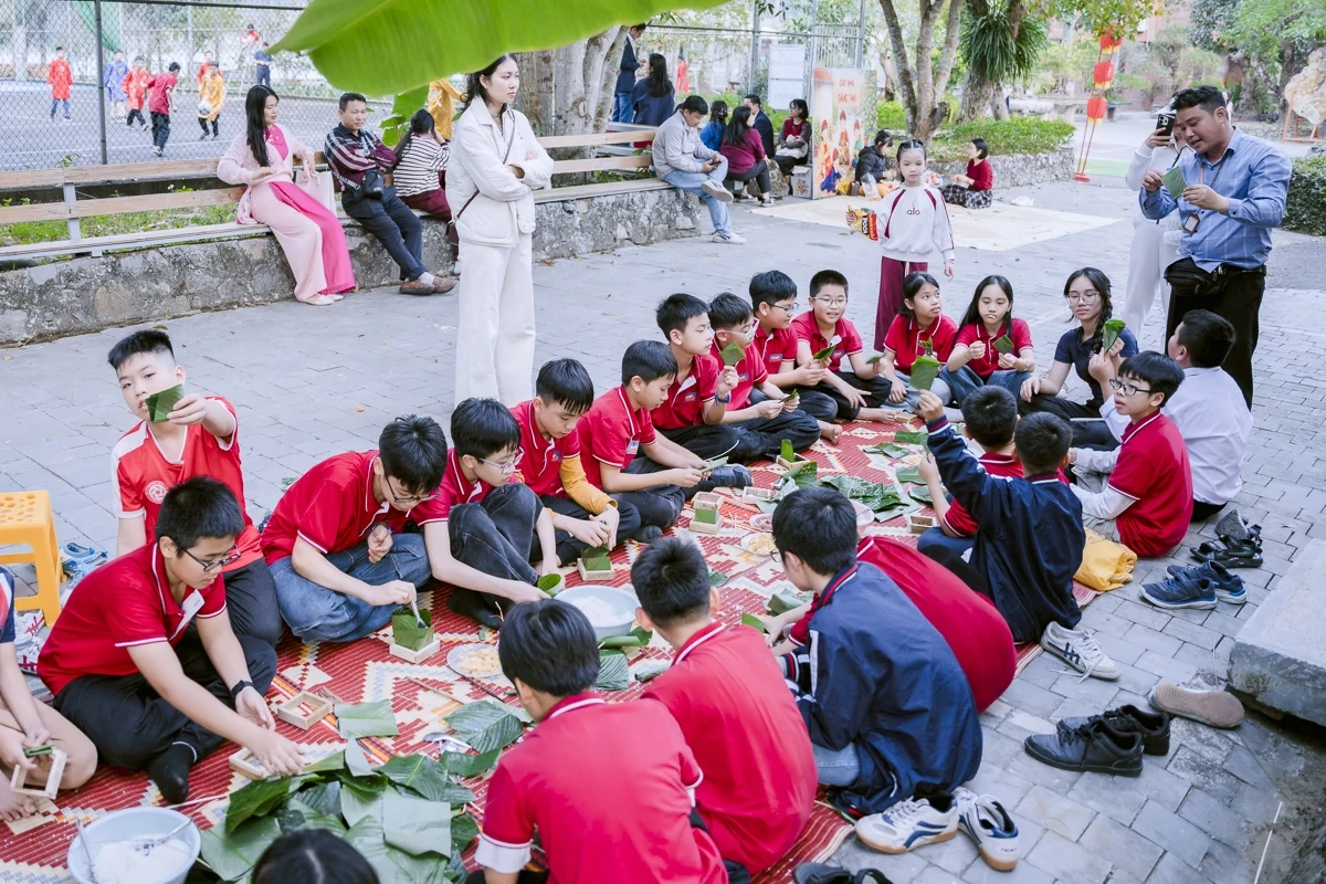 Khi tham gia chương trình “Hướng về cội nguồn – Chợ quê Tết xưa”, các em học sinh được trực tiếp trải nghiệm gói bánh chưng, viết chữ thư pháp, làm tranh Đông Hồ, nặn tò he và hòa mình vào các trò chơi dân gian.