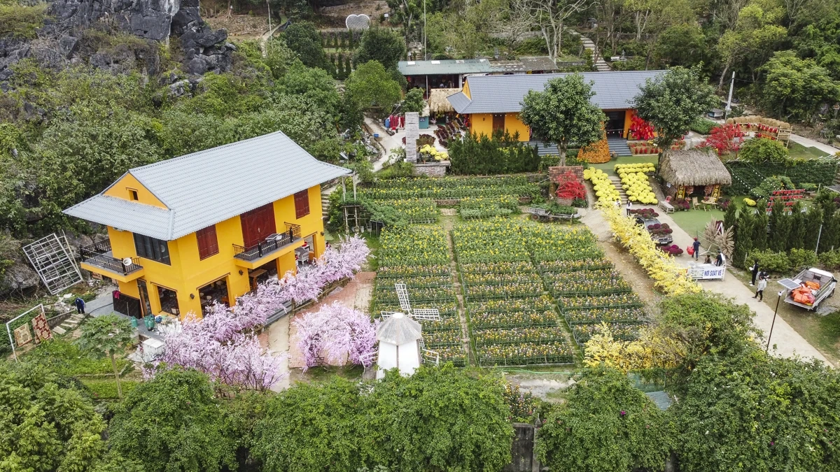 Toàn cảnh Khu du lịch Động Tiên Sơn nhìn từ trên cao, nổi bật với các khu vườn hoa, tiểu cảnh Tết và không gian sinh hoạt cộng đồng hài hòa với thiên nhiên.