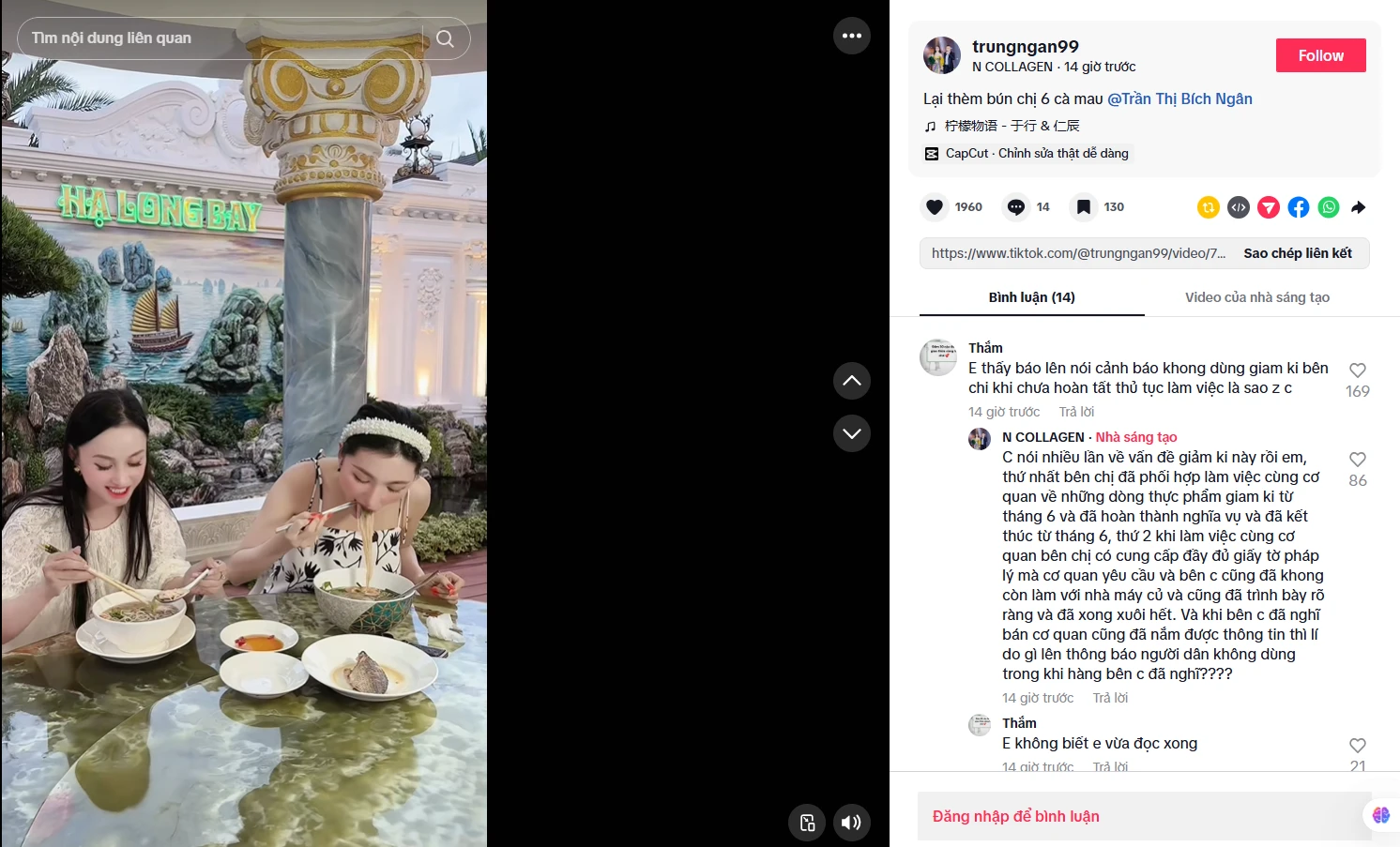Trước thông tin này, nhiều người tiêu dùng thắc mắc trên trang TikTok tick xanh N COLLAGEn (trungngan99). Trong video mới nhất, cô đăng tải nội dung gặp gỡ người bạn và cũng ăn bún, N COLLAGEN đã để lại bình luận giải thích thắc mắc của người tiêu dùng.
