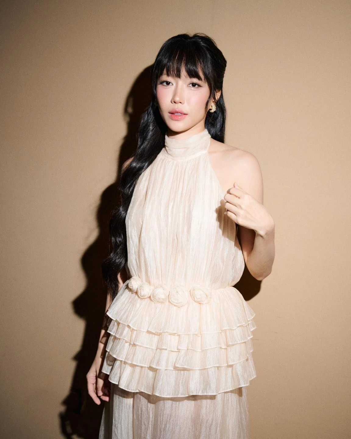 Tại một sự kiện diễn ra mới đây, Diệu Nhi thu hút sự chú ý khi xuất hiện trong chiếc váy màu be dáng rộng. Thiết kế với phần thân trên suông thoải mái và phần chân váy nhiều lớp xếp ly giúp tôn nét nữ tính, đồng thời khéo léo che đi vòng hai.