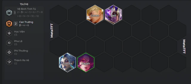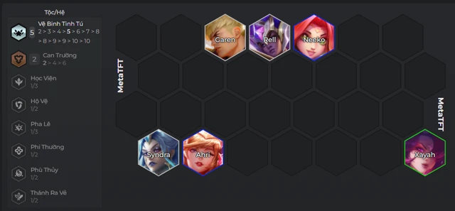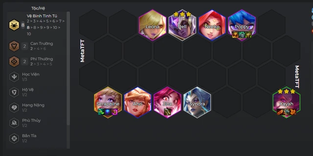 Với đội hình Vệ Binh Tinh Tú, người chơi có thể sớm hoàn thiện cả dàn chắn và sát thương phía sau, với 3 vị tướng giá rẻ là Rell (1 vàng), Syndra (1 vàng) và Xayah (2 vàng). Với một vị trí còn khuyết, người chơi có thể sử dụng một tướng thuộc Can Trường (như Xin Zhao) để kích hệ và là dày thêm khả năng phòng ngự. Syndra cũng là vị tướng giữ đồ tốt cho Ahri hay Seraphine vào cuối trận.
