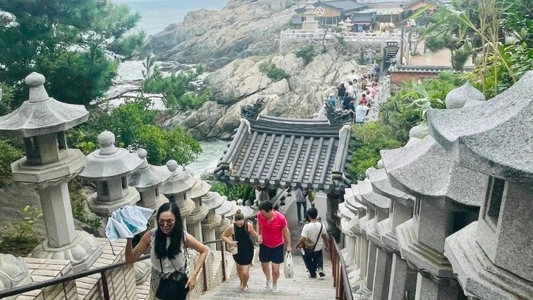 Chưa hết lâng lâng với cảm giác được "chạm tới bầu trời" ở đài quan sát BUSAN X the SKY, cả đoàn đã lại phải trầm trồ khi đặt chân đến chùa Haedong Yonggungsa. Thay vì nằm ẩn trong địa hình rừng núi như nhiều ngôi chùa khác, Haedong Yonggungsa là ngôi chùa hiếm hoi được xây dựng với kiến trúc hướng ra biển, tạo nên cảnh sắc vừa nên thơ, vừa hùng vĩ.