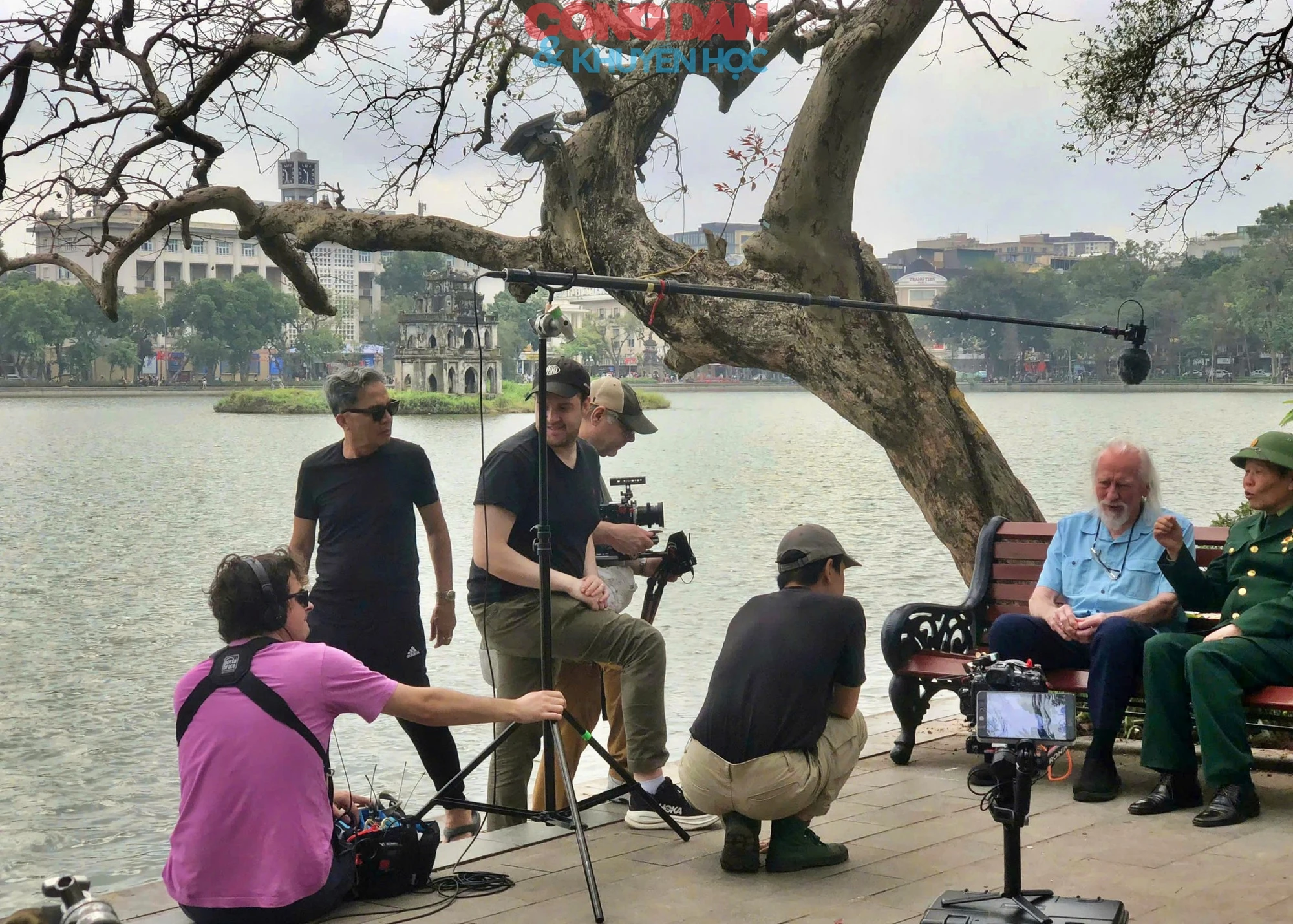 Một nhóm quay phim truyền hình quốc tế thực hiện phỏng vấn bên Hồ Gươm tại Thủ đô Hà Nội của Việt Nam sáng 16/3. Ảnh: Thanh Nguyễn