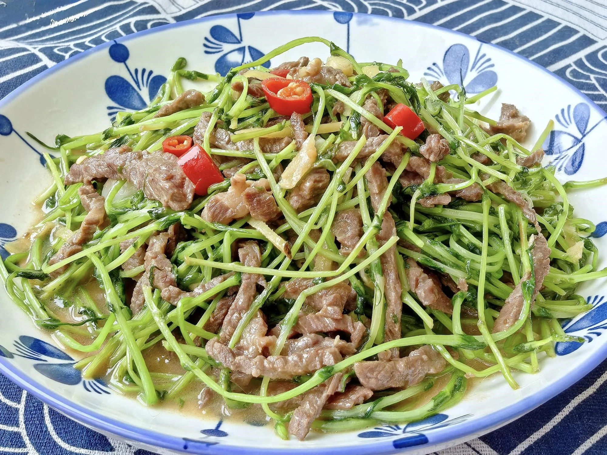 Thành phẩm món thịt bò xào rau mầm đậu Hà Lan