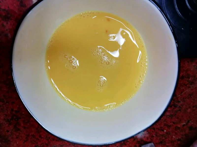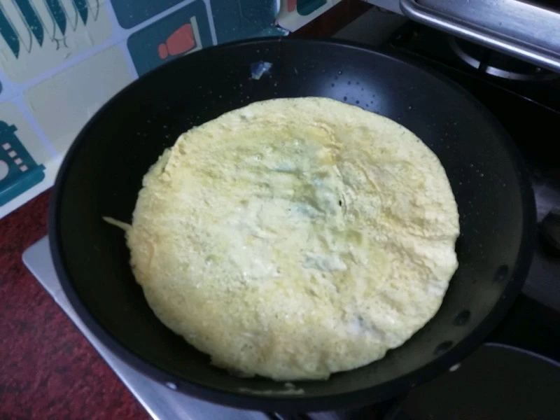 Bước 2: Đặt chảo lên bếp, cho lượng dầu ăn vừa phải vào. Khi dầu nóng khoảng 70% thì bạn đổ trứng vào chiên cho đến khi đông lại. Lật mặt còn lại và chiên cho đến khi chín vàng. Sau đó bạn có thể dùng thìa xắt thành các miếng nhỏ hoặc cho ra đĩa và thái thành các dải có độ dài vừa phải.