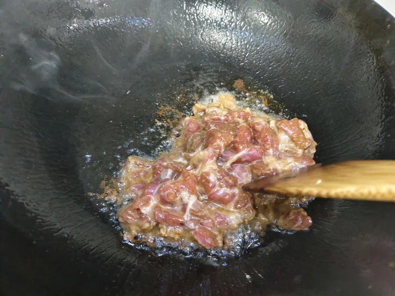 Bước 2: Đun nóng dầu trong chảo. Sau đó cho tỏi và gừng băm vào xào thơm. Tiếp theo cho thịt bò đã ướp vào xào nhanh tay. Đến khi thịt chuyển màu thì trút ra đĩa, để dùng sau.