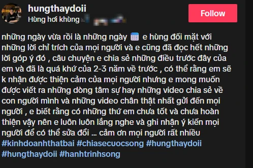 “Những ngày vừa rồi là những ngày em Hùng đối mặt với những lời chỉ trích của mọi người và em cũng đã đọc hết những lời góp ý đó. Câu chuyện em chia sẻ những điều trước đây và đã là quá khứ của 2-3 năm về trước. Có thể rằng em sẽ không nhận được thiện cảm của mọi người nhưng em mong muốn được viết ra những dòng tâm sự hay những video chia sẻ về con người mình và những video chân thật nhất gửi đến mọi người. Em biết rằng có những thứ em chưa tốt và chưa hoàn thiện vậy nên luôn luôn lắng nghe và ghi nhận ý kiến mọi người để có thể sửa đổi. Cảm ơn mọi người rất nhiều” , anh cho hay.