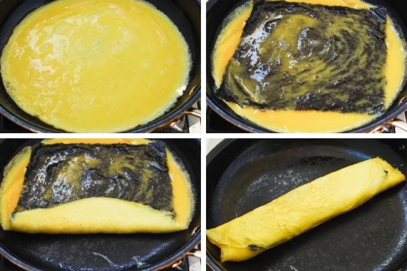 Đầu tiên, bạn đập trứng vào tô rồi thêm muối, tiêu và hành lá, sau đó đánh đều lên. Tiếp theo, bạn cho chảo chống dính lên bếp và cho một ít dầu ăn vào. Đợi dầu nóng thì bạn tráng trứng thành một lớp mỏng trên chảo. Khi mặt trứng hơi se lại, bạn hãy nhẹ nhàng đặt rong biển lên trên. Ở bước này, bạn hãy bắt đầu cuộn trứng lại từ góc ngoài cùng, sau đó chiên thêm 1 phút rồi tắt bếp. Cho trứng ra dĩa, sau đó lấy con dao nhỏ rồi cắt thành từng khoanh vừa ăn.