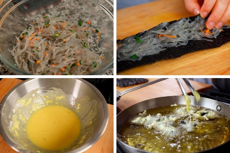 Đầu tiên, bạn cần ngâm miến cho mềm, sau đó cắt ngắn rồi trộn với gói nêm gia vị có sẵn trong bịch miến. Bạn trải lá rong biển ra mặt phẳng, tiếp theo thì dàn đều nhân miến lên rồi cuộn lại. Bạn đập một quả trứng là dĩa và đánh đều, sau đó lăn cuộn miễn qua trứng đánh tan và bột chiên giòn. Cuối cùng, bạn chỉ cần chiên cuộn miến cho thật vàng giòn, sau đó để ráo dầu là có thể thưởng thức.