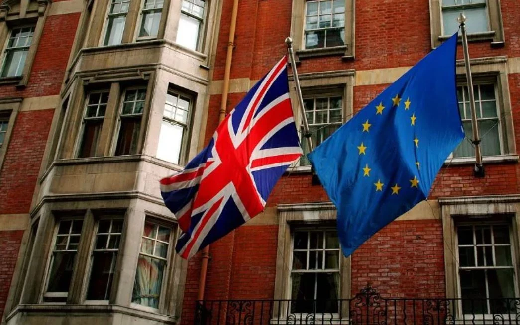 Quốc kỳ Liên hiệp Vương quốc Anh và cờ châu Âu trên một tòa nhà ở London. Ảnh: carbonherald.com