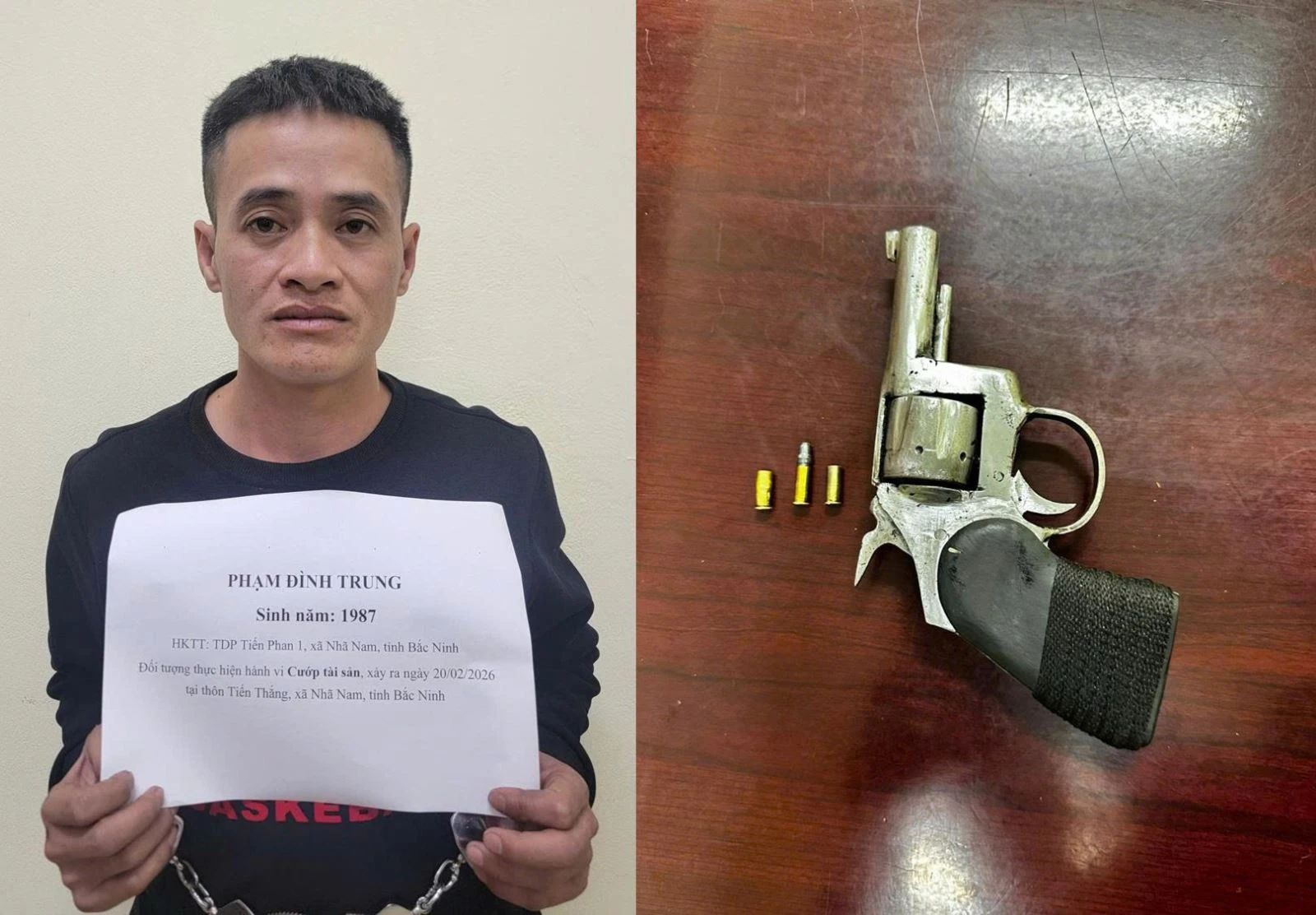 Đến khoảng 20h10, cảnh sát đã phát hiện và bắt giữ thành công đối tượng gây án tại Tỉnh lộ 295B, đoạn qua TDP Nếnh, phường Nếnh.