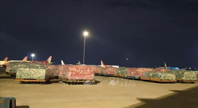 Các lô hàng được bốc dỡ xuống sân bay. Ảnh: TTXVN phát