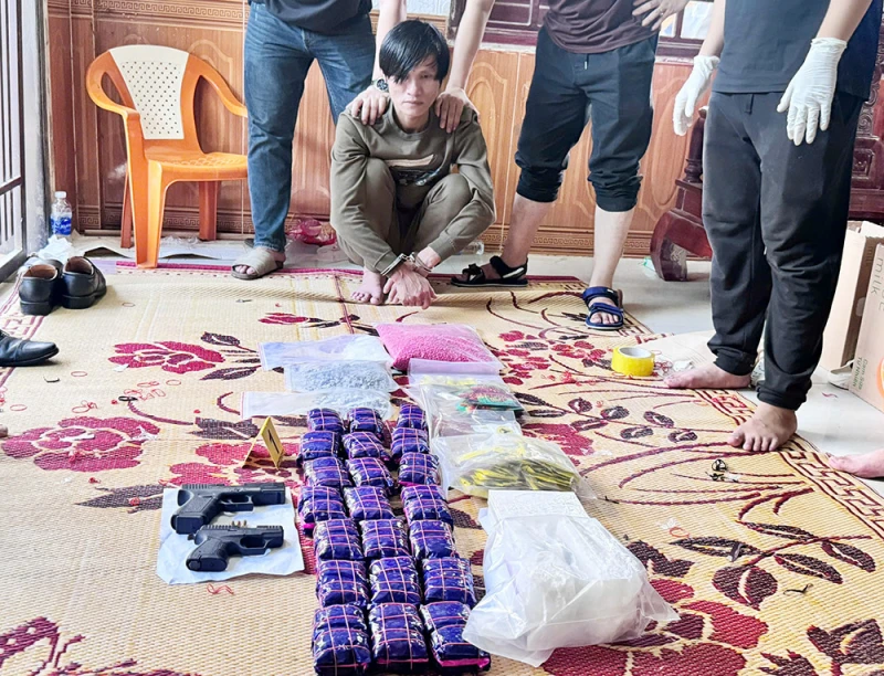 Tổng khối lượng khoảng 14kg ma túy các loại, 2 khẩu súng quân dụng, 3 viên đạn, 2 cân tiểu ly, 1 máy dập, đóng gói bao bì.