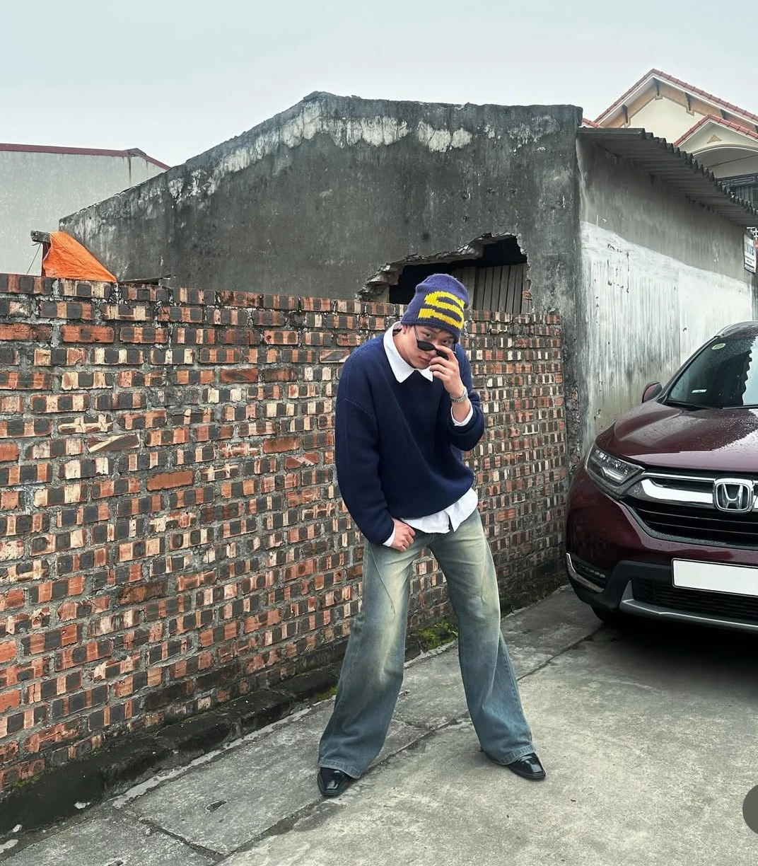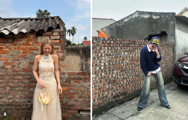 Tuy nhiên, nếu nhìn kỹ hơn sẽ nhận ra khung cảnh trong ảnh của Dương Domic và Linh Ka không giống nhau. Kiểu tường gạch đỏ, mái ngói cũ vốn là phong cách nhà quen thuộc ở nhiều vùng miền Bắc, đặc biệt là khu vực làng quê. Background mang hơi hướng hoài cổ như thế này không hề hiếm trong dịp Tết khi nhiều bạn trẻ chọn làm điểm check-in.