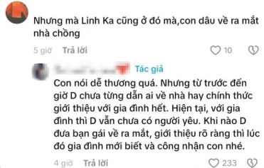 Mới đây, cư dân mạng tiếp tục đổ dồn sự quan tâm vào bình luận được cho là dì của Dương Domic. Khi một netizen cho rằng Linh Ka ăn Tết chung cùng với nam ca sĩ, đã được ra mắt gia đình, tài khoản MXH người thân của anh đã phủ nhận, cho biết chưa một ai được dẫn về ra mắt. Cô cho biết khi được Dương Domic giới thiệu rõ ràng thì mối quan hệ đó mới là chính thức.