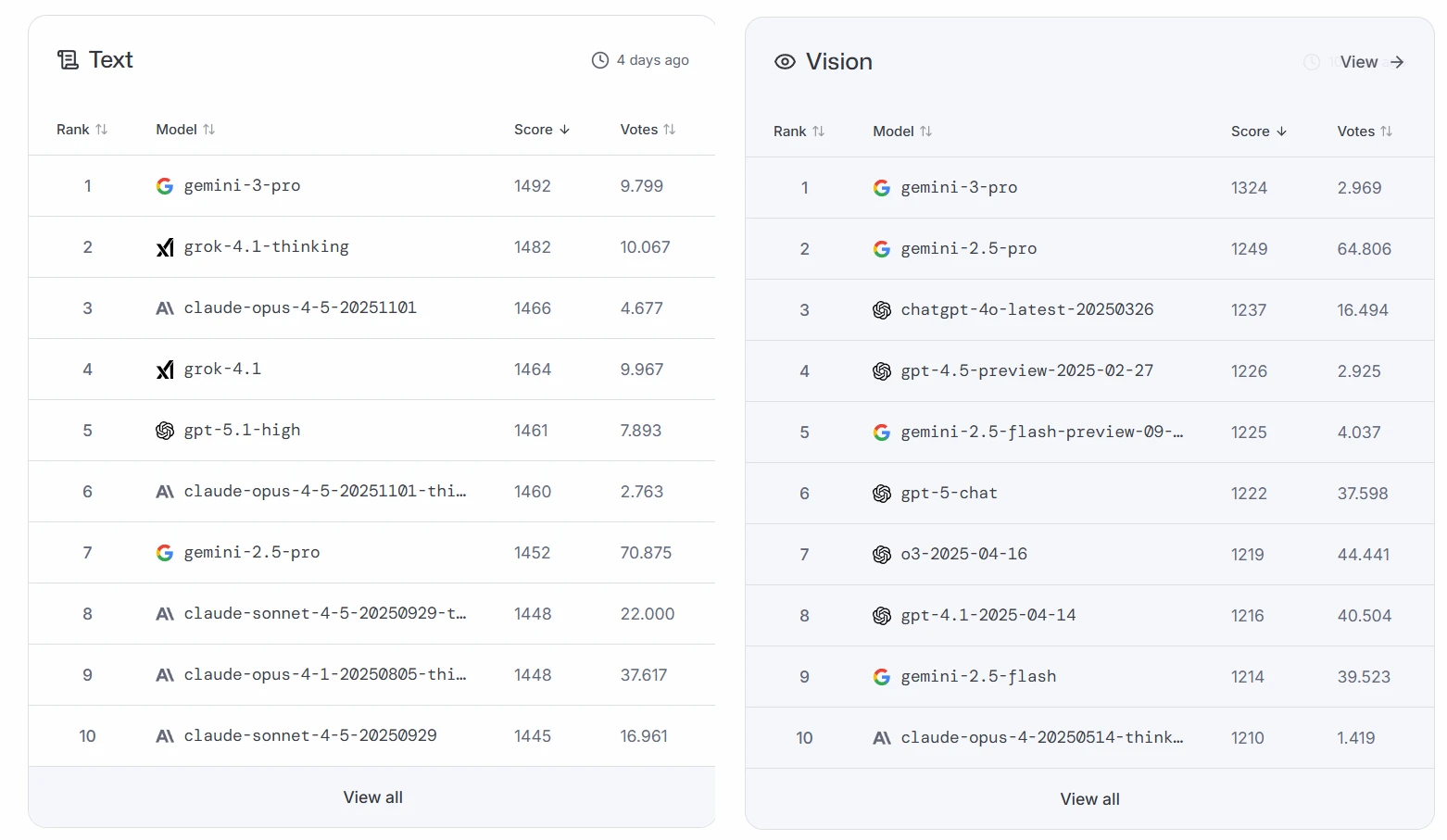 Nổi bật nhất trong nhóm là sự bứt phá của Google với Gemini 3.0. Từ vị thế từng bị xem là ” gã khổng lồ chậm nhịp”, Google tận dụng lợi thế hạ tầng để lật ngược tình thế. Dựa trên bảng xếp hạng LMArena cập nhật ngày 26.11, Gemini 3.0 Pro của Google đang giữ vị trí dẫn đầu thị trường trong nhiều lĩnh vực cốt lõi.
