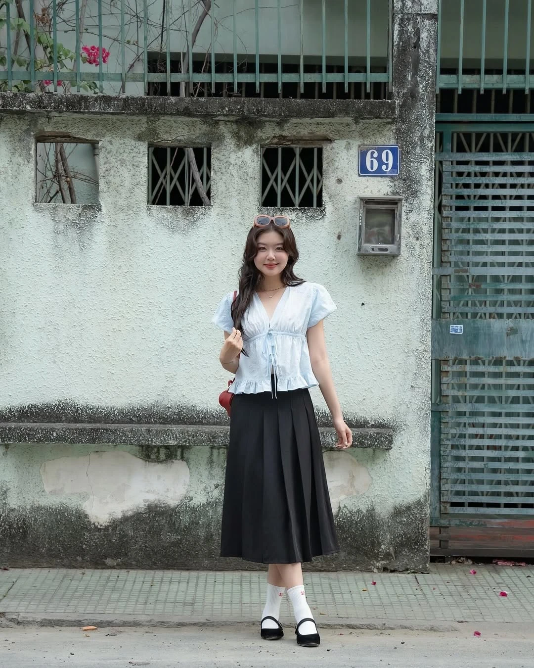 Công thức áo sơ mi đỏ nổi bật và chân váy trắng gây ấn tượng ở nét dịu dàng, nữ tính mà không kém phần trẻ trung. Khi diện combo này, chị em đừng quên thao tác sơ vin để tôn dáng tối ưu, đồng thời tăng thêm điểm thanh lịch cho set đồ.