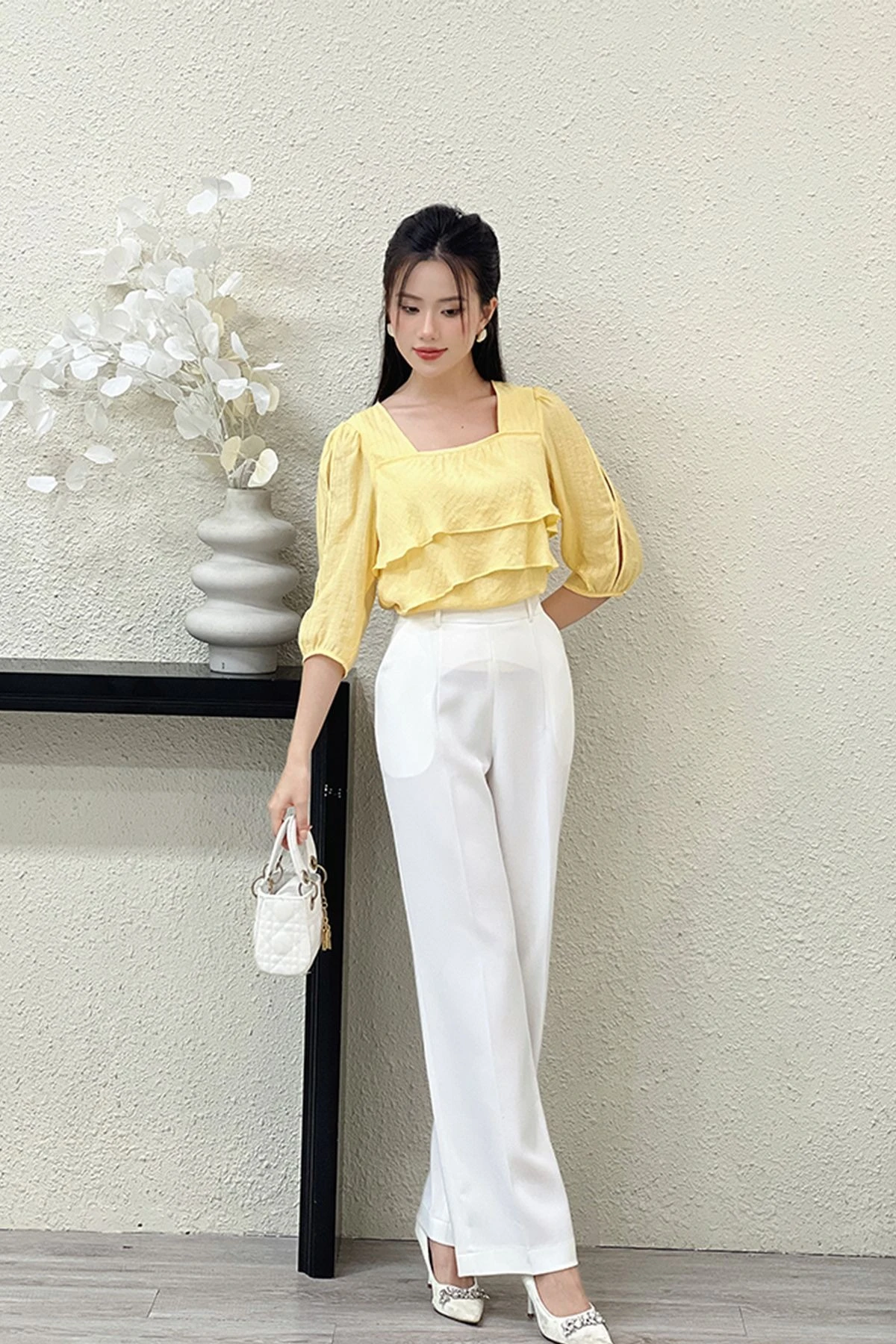 Hãy biến hóa môi trường công sở quen thuộc bằng cách khoác lên mình chiếc áo blouse tay bèo đầy nữ tính, kết hợp cùng chân váy ngắn hoặc quần shorts đồng điệu về màu sắc. Đừng ngần ngại phá cách với những gam màu nổi bật hoặc họa tiết độc đáo, tạo nên điểm nhấn ấn tượng cho phong cách cá nhân. Để hoàn thiện vẻ ngoài thanh lịch, hãy lựa chọn những phụ kiện tinh tế như vòng cổ ngọc trai, khuyên tai dáng dài hoặc một chiếc túi xách mini thời thượng. Một đôi giày cao gót mũi nhọn hoặc xăng đan quai mảnh sẽ là mảnh ghép hoàn hảo, tôn lên vóc dáng và khí chất của bạn.