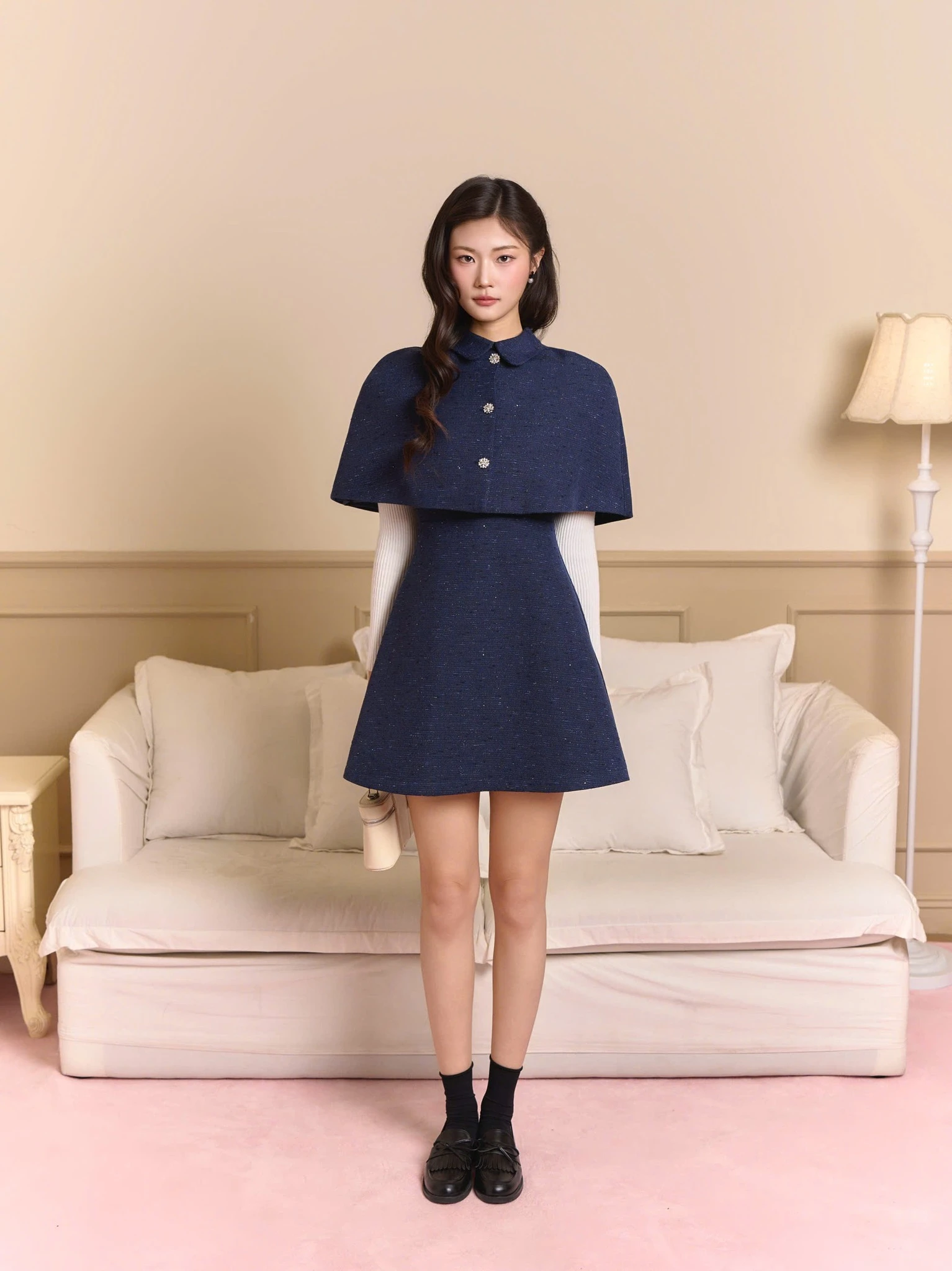 Thiết kế mang đậm nét ngọt ngào với áo khoác tay lỡ cổ sen mềm mại tạo điểm nhấn cho phần cổ và bờ vai, kết hợp cùng chân váy A-line che khuyết điểm tinh tế. Chất liệu dạ đứng phom vừa đủ giữ ấm mà vẫn nhẹ nhàng, nữ tính