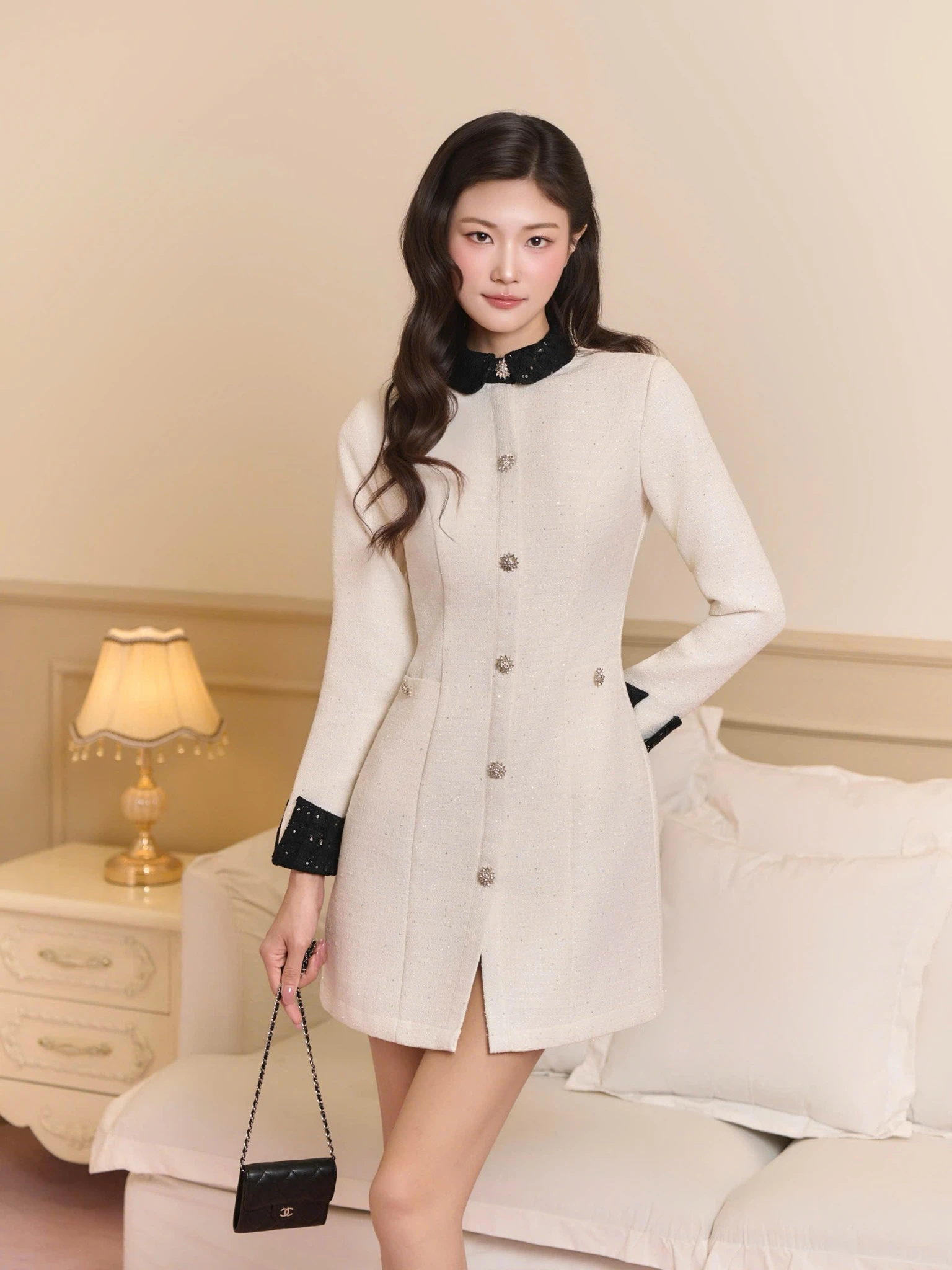 Thiết kế dáng váy mini coat thanh lịch với tông kem ngọt ngào, điểm xuyết cổ và tay áo màu đen tạo nét tương phản; phom váy dáng chữ A phối cổ đức, nẹp khuy đính đá giúp khắc họa hình ảnh sang trọng