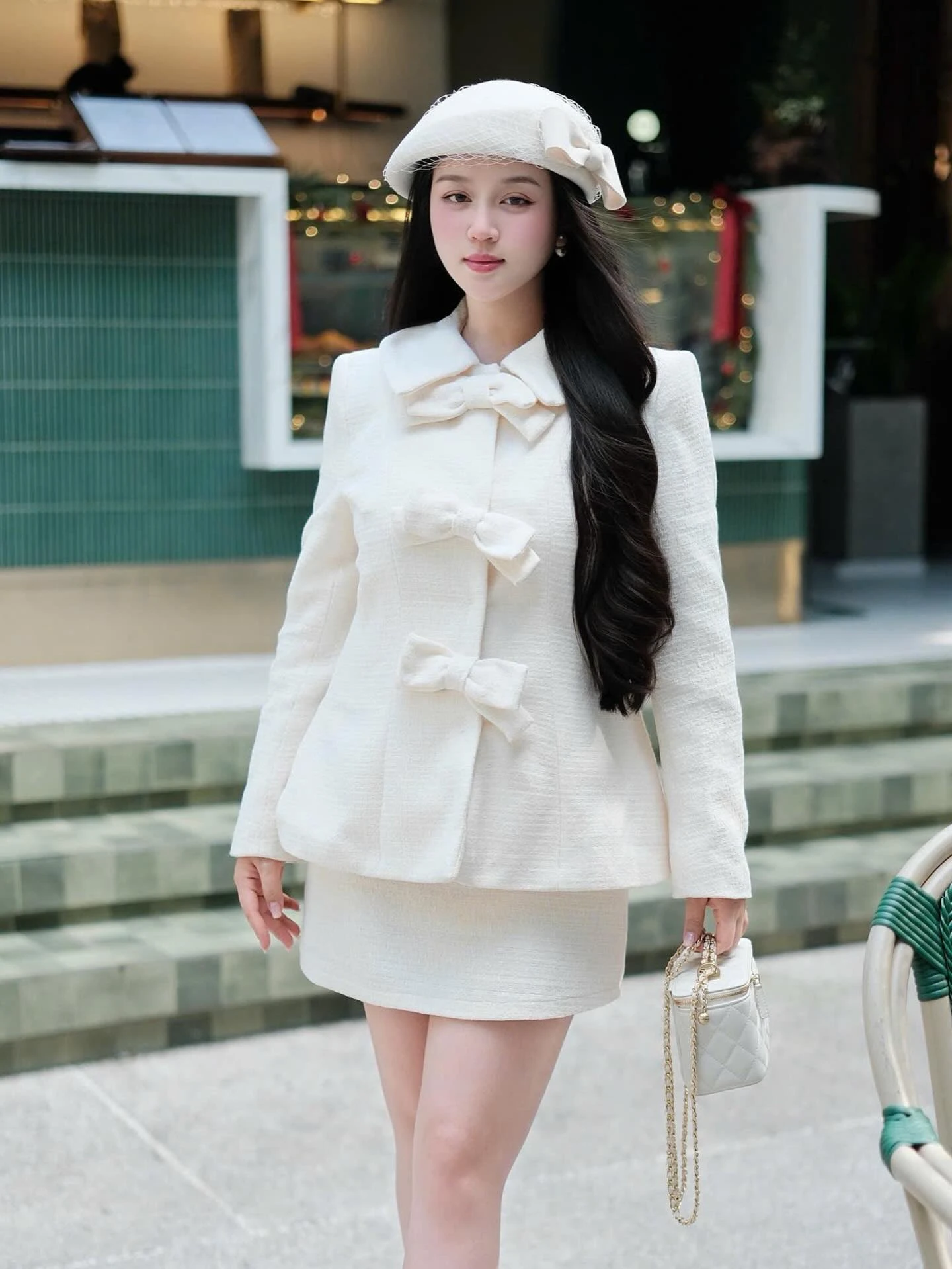 Tựa như một quý cô Anh quốc thanh nhã, bộ tweed kem điểm nơ đen mang vẻ đẹp cổ điển mà vẫn thời thượng. Phom áo ôm nhẹ cùng chân váy ngắn tạo nét lịch thiệp, rất hợp cho những khoảnh khắc cần sự trang trọng