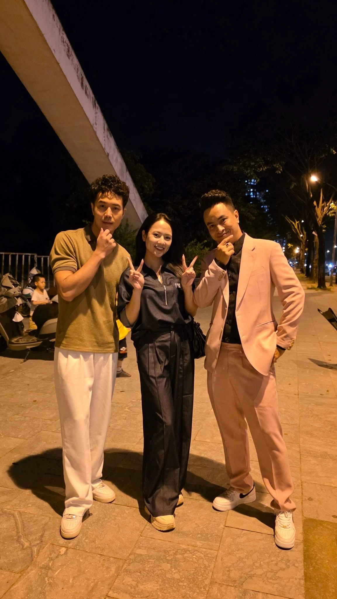Ngân bên hai anh chàng đồng hương – Dũng và Tiền – ở hậu trường phim