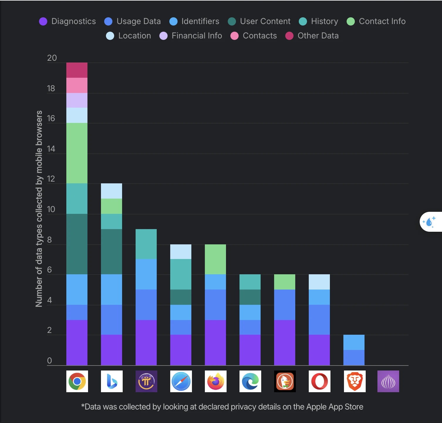 Nghiên cứu của Surfshark cho thấy, trong số 10 trình duyệt được phân tích, Chrome là trình duyệt duy nhất thu thập thông tin tài chính (phương thức thanh toán, số thẻ, thông tin tài khoản ngân hàng) và danh sách liên hệ từ điện thoại của người dùng.