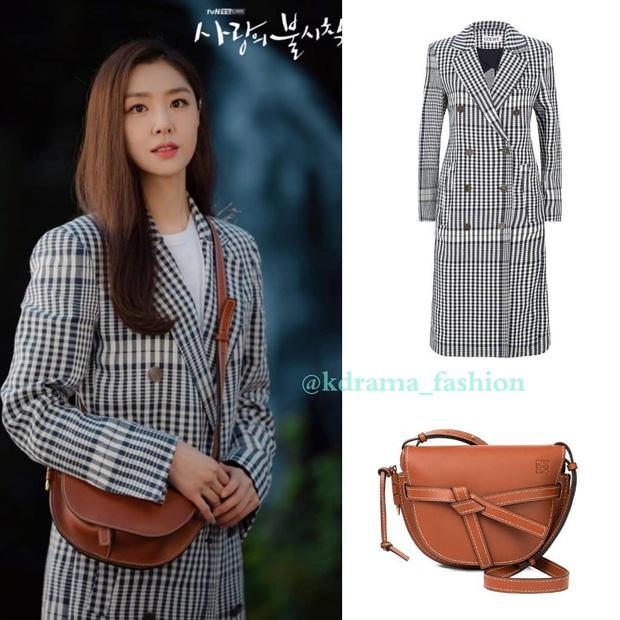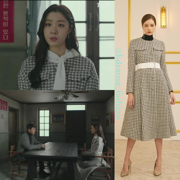 Se Ri có áo điệu thì Seo Dan cũng không thua kém, thiết kế áo khoác dáng chữ A xòe nhẹ được cô nàng diện khi gặp vị hôn phu của mình. Họa tiết ô đen trắng cùng chất liệu tweed giúp thiết kế càng thêm sang chảnh. Chiếc áo đến từ nhà mốt Jigoti có giá hơn 29 triệu đồng.