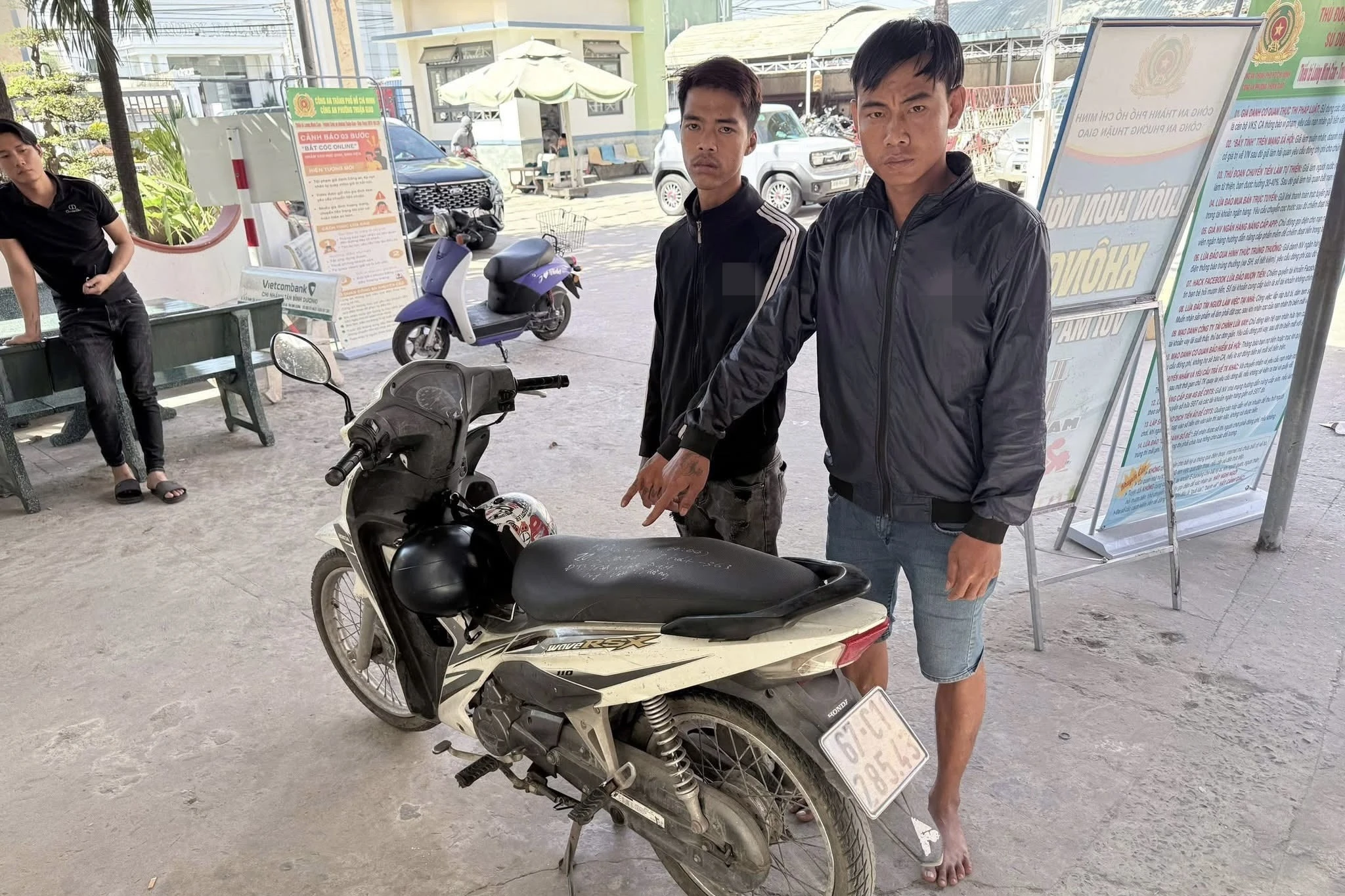 Qua kiểm tra nhanh, cả hai dương tính với ma tuý. Hai đối tượng khai nhận vừa trộm cắp chiếc xe máy 67C1-285.43 tại một phòng trọ ở khu phố Bình Giao, đang tẩu thoát thì gặp tổ tuần tra.