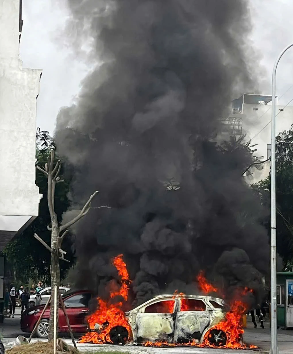 Ngọn lửa bùng lên nhanh chóng khiến chiếc xe bị thiêu rụi, lan sang cả xe bên cạnh.