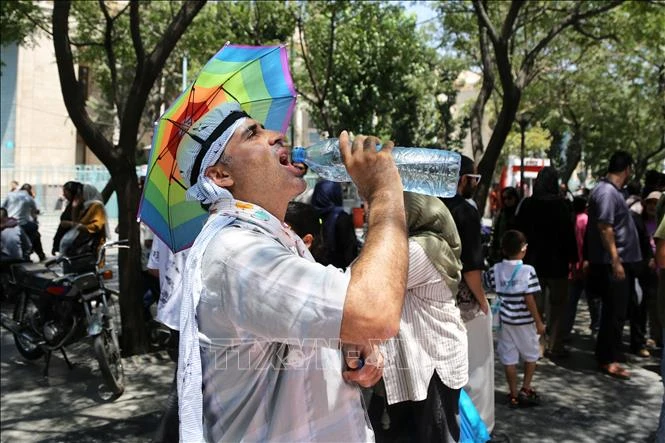 Người dân uống nước giải nhiệt dưới thời tiết nắng nóng tại Tehran, Iran ngày 22/7/2025. Ảnh: THX/TTXVN