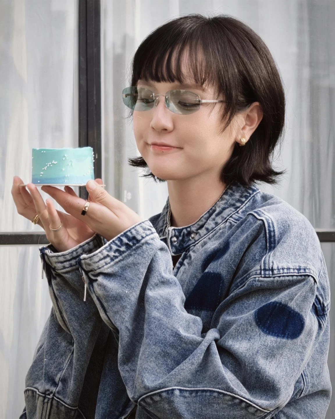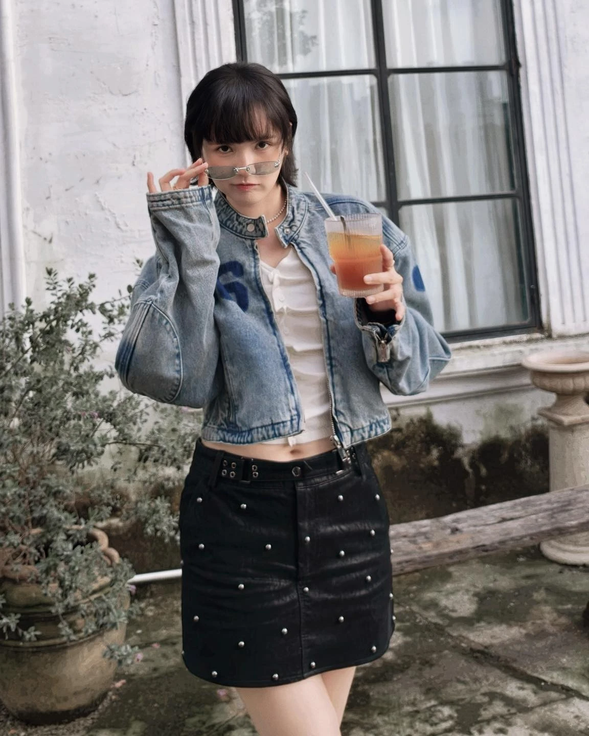 Hải Tú chọn outfit đơn giản nhưng cực kỳ ăn điểm: áo khoác denim dáng rộng kết hợp chân váy ngắn đính hạt và giày sneaker năng động. Kiểu tóc ngắn uốn cụp cùng mái bằng càng khiến cô trông trẻ trung, đáng yêu hơn. Biểu cảm của Hải Tú vẫn là điểm nhấn quen thuộc – nụ cười khẽ, ánh mắt hiền và dáng vẻ tự nhiên trong từng khung hình.