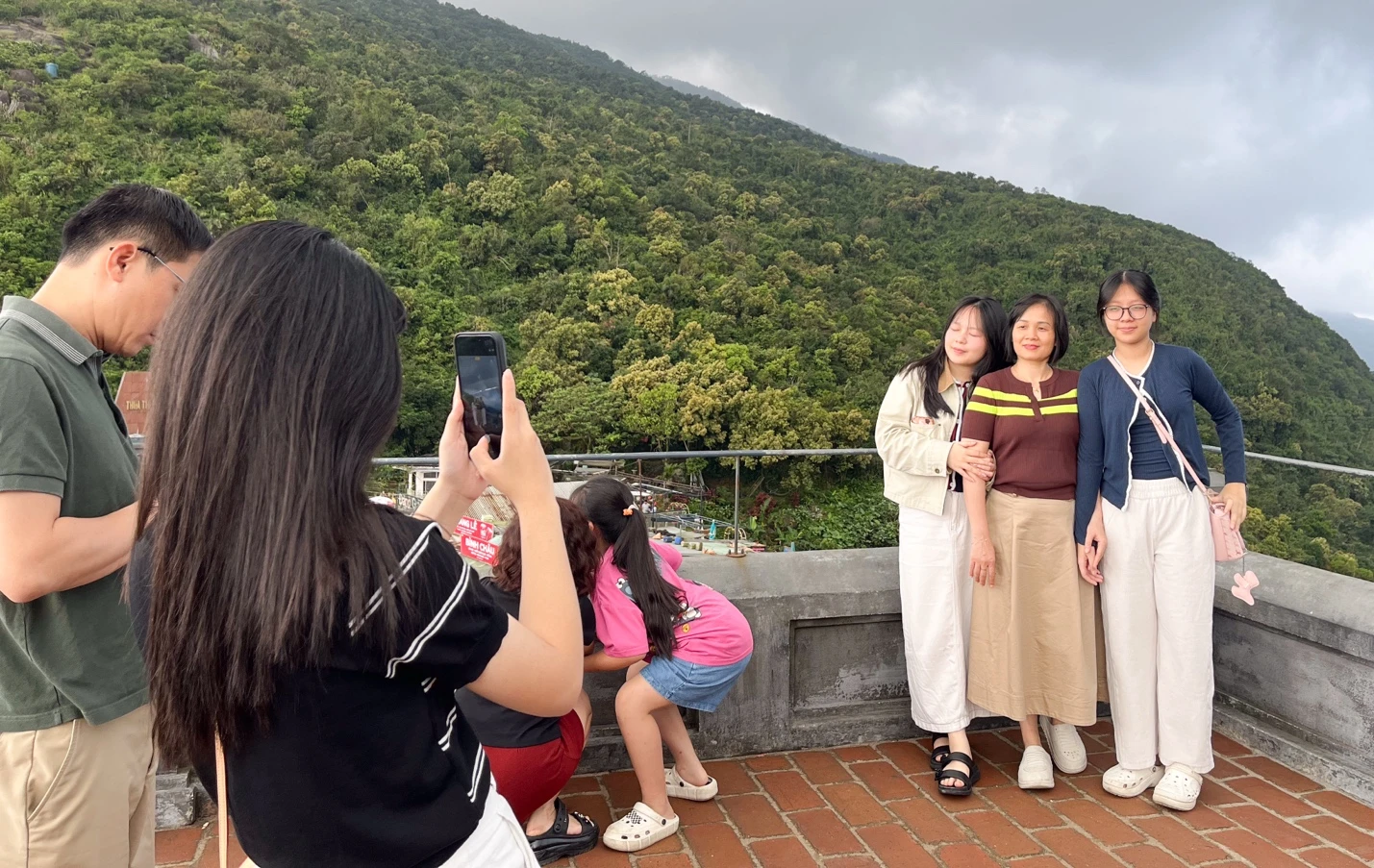Du khách Hàn Quốc chụp ảnh lưu niệm tại Hải Vân Quan. Ảnh: XUÂN SƠN