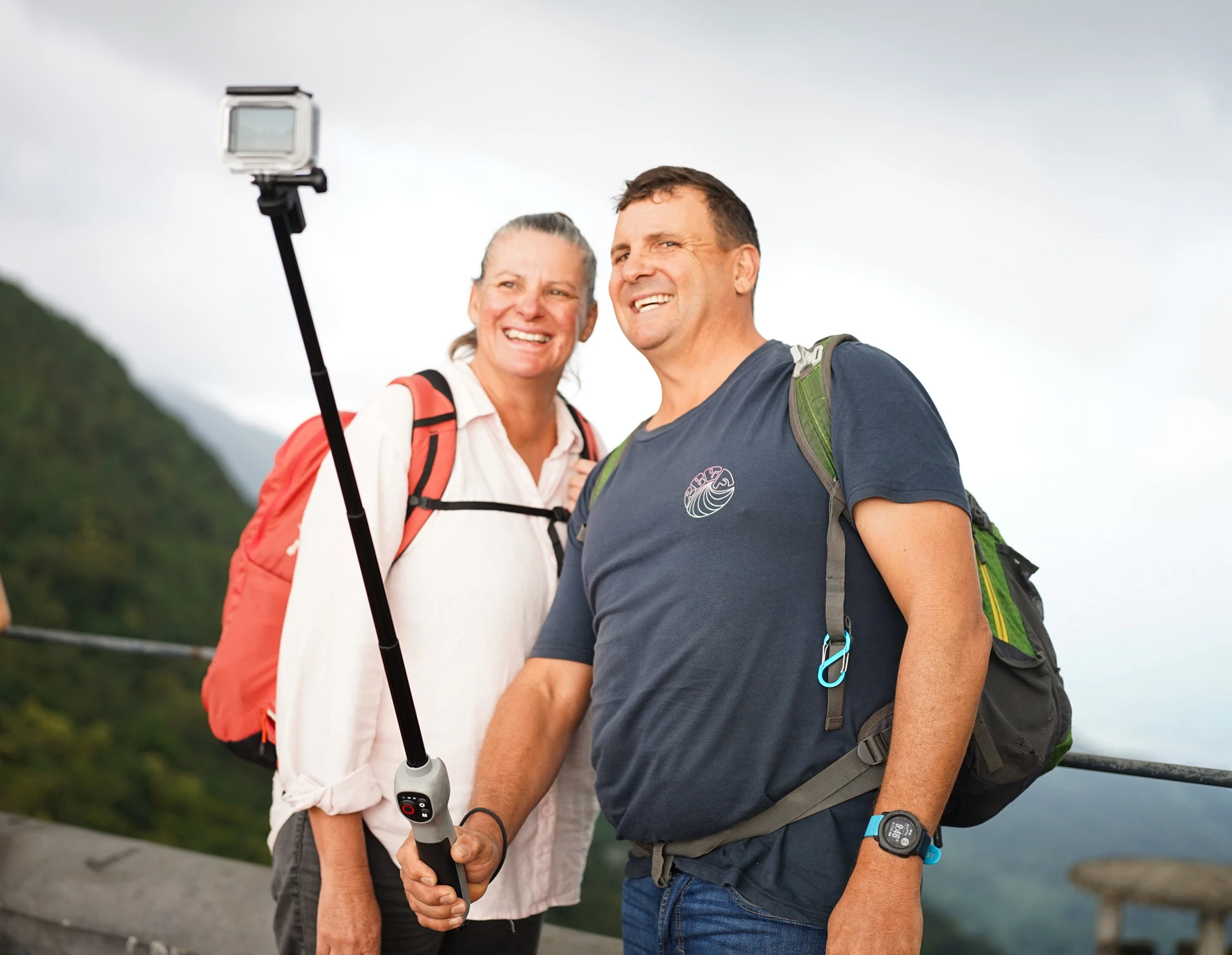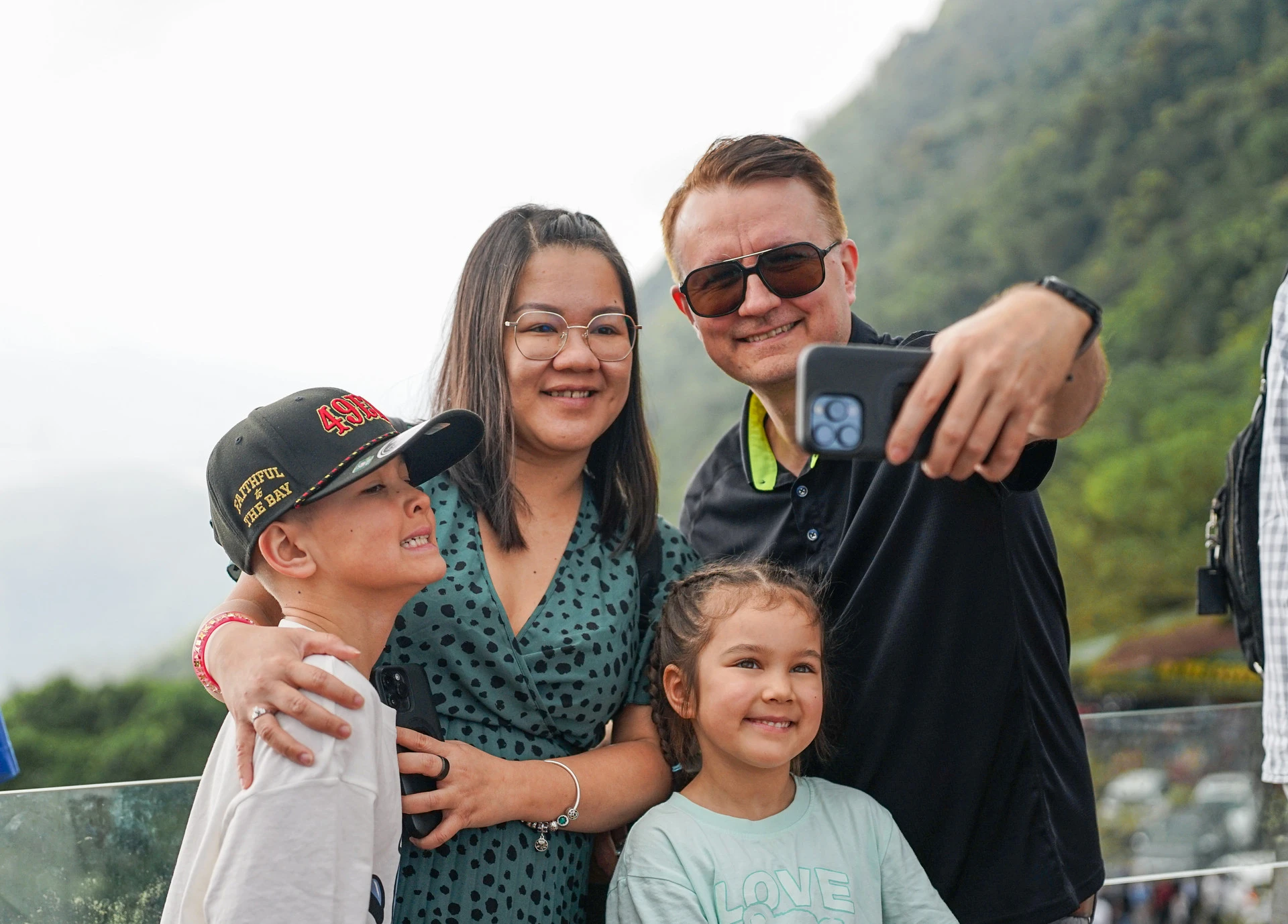 Gia đình anh Miska (du khách từ Phần Lan) di chuyển từ trung tâm thành phố Đà Nẵng lên đèo Hải Vân trải nghiệm vào sáng mùng 4 Tết.. Ảnh: XUÂN SƠN