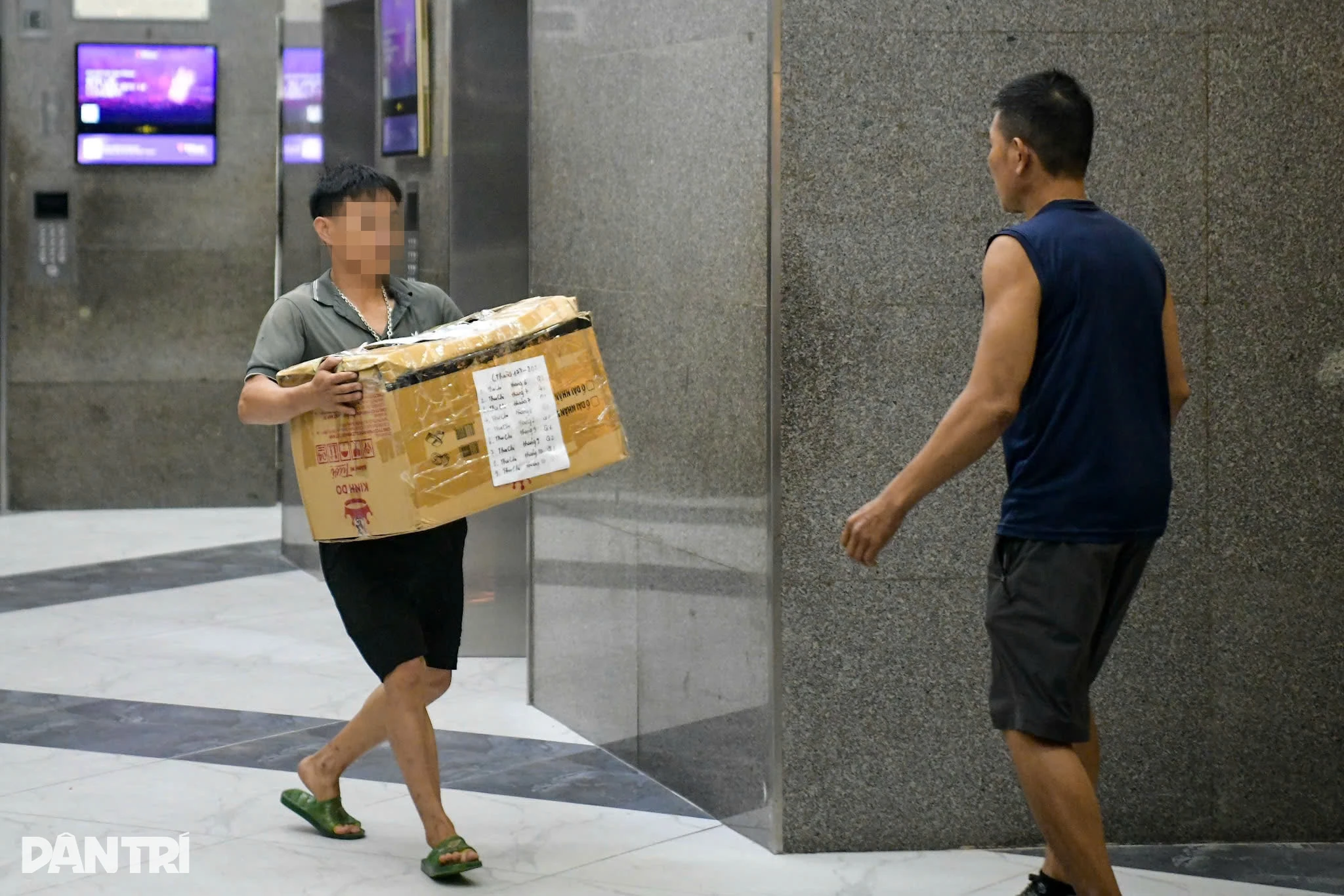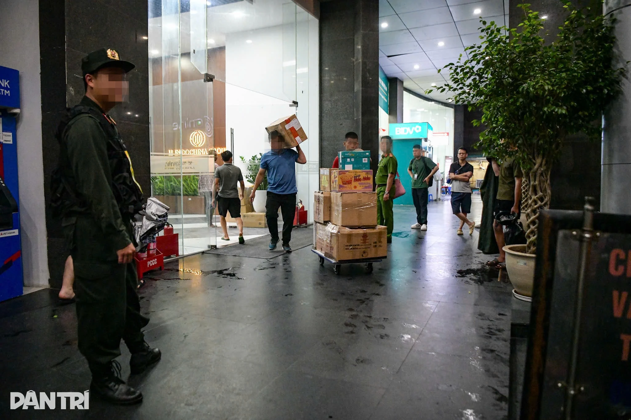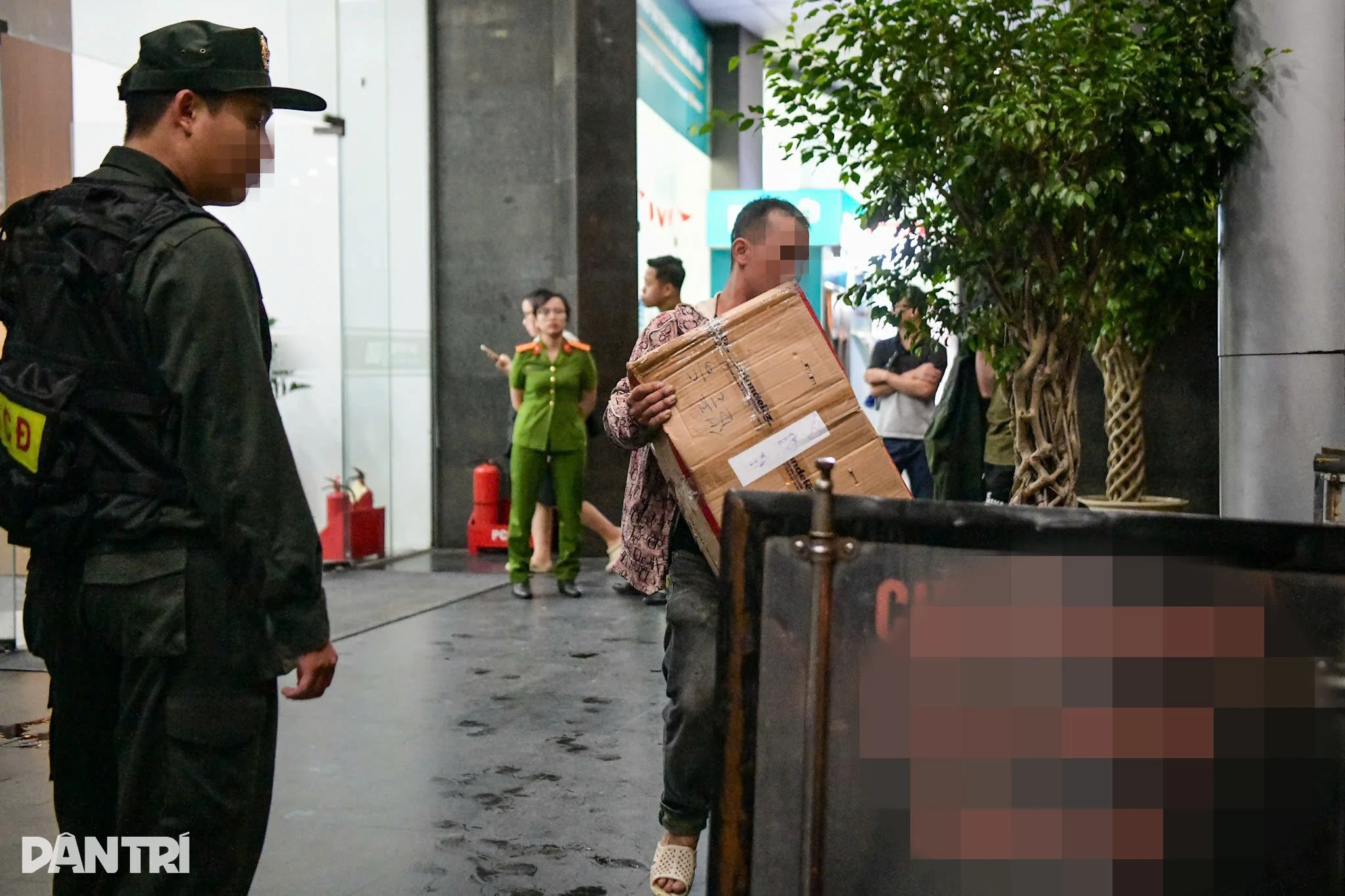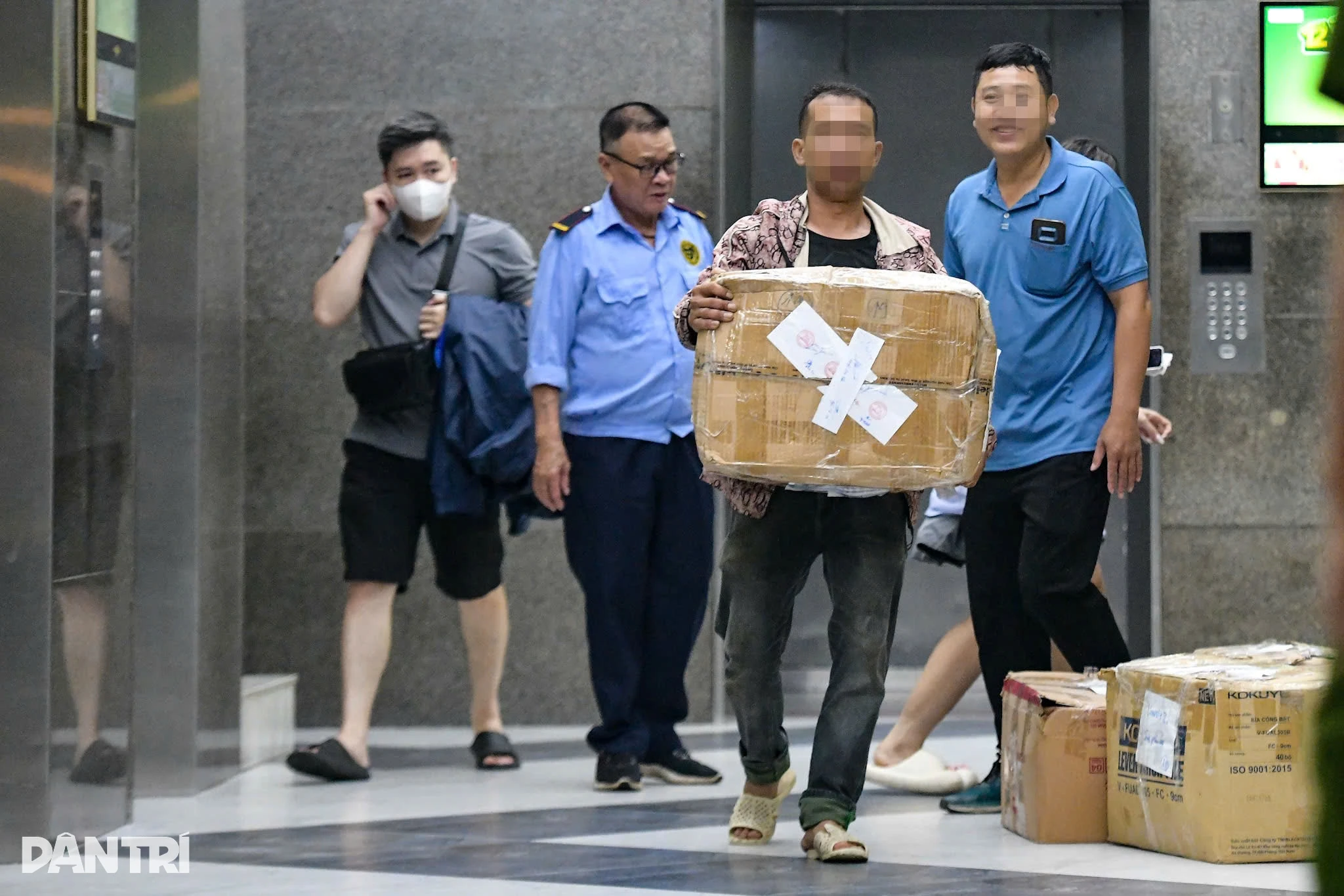 Đến tối 7/10, dưới sự giám sát của công an, một số người đưa hàng chục thùng giấy chứa tài liệu xuống sảnh tầng 1 tòa nhà 18 Tam Trinh.