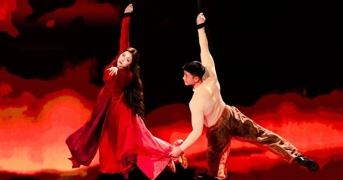 Hòa Minzy và nghệ sĩ xiếc Trịnh Ngọc Hiếu trong tiết mục đu người trên cao (Ảnh: Ban tổ chức).