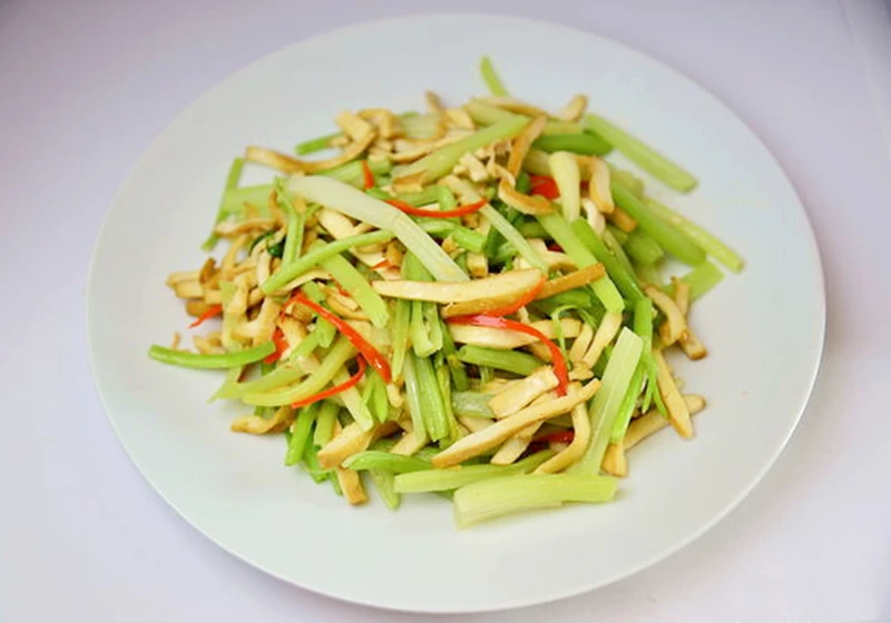 Cần tây sau khi sơ chế, cắt khúc nhỏ vừa ăn thì thả vào nồi nước sôi, chần qua. Việc chần cần tây trước khi xào sẽ giúp cần tây giòn hơn. Đậu phụ bạn cắt thành lát mỏng sau đó chiên sơ để tăng thêm hương thơm, không bị gãy nát. Sau khi chiên xong thì cắt dạng sợi. Xào nhanh cần tây và đậu phụ với chút dầu, nêm một chút gia vị, đảo đều là có thể thưởng thức.