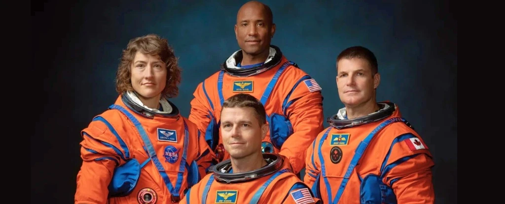 Phi hành đoàn của Artemis II của NASA (từ trái sang phải): 3 nhà du hành NASA Christina Hammock Koch, Reid Wiseman (ngồi), Victor Glover và 1 nhà du hành của Cơ quan Vũ trụ Canada Jeremy Hansen (ảnh: NASA).